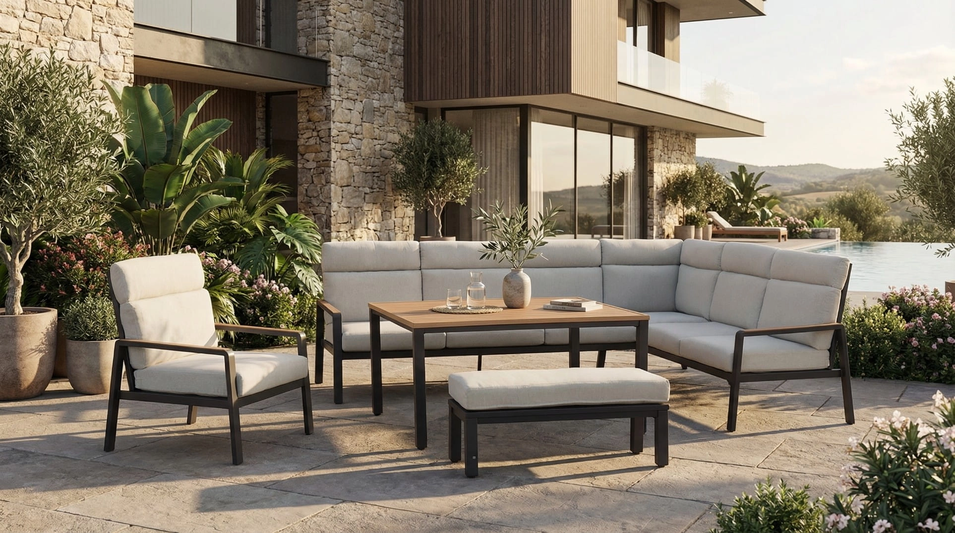 ASTON świetnie współgra z lampionami, donicami w kolorze czarnym, beżowymi lub jutowymi dodatkami, dywanem zewnętrznym oraz oświetleniem ogrodowym. Możesz zestawić go z roślinami w dużych osłonkach, drewnianymi dekoracjami i ciepłym światłem, tworząc miejsce idealne na rodzinne spotkania na tarasie, spokojny poranek z kawą lub letnie przyjęcia w ogrodzie z bliskimi.