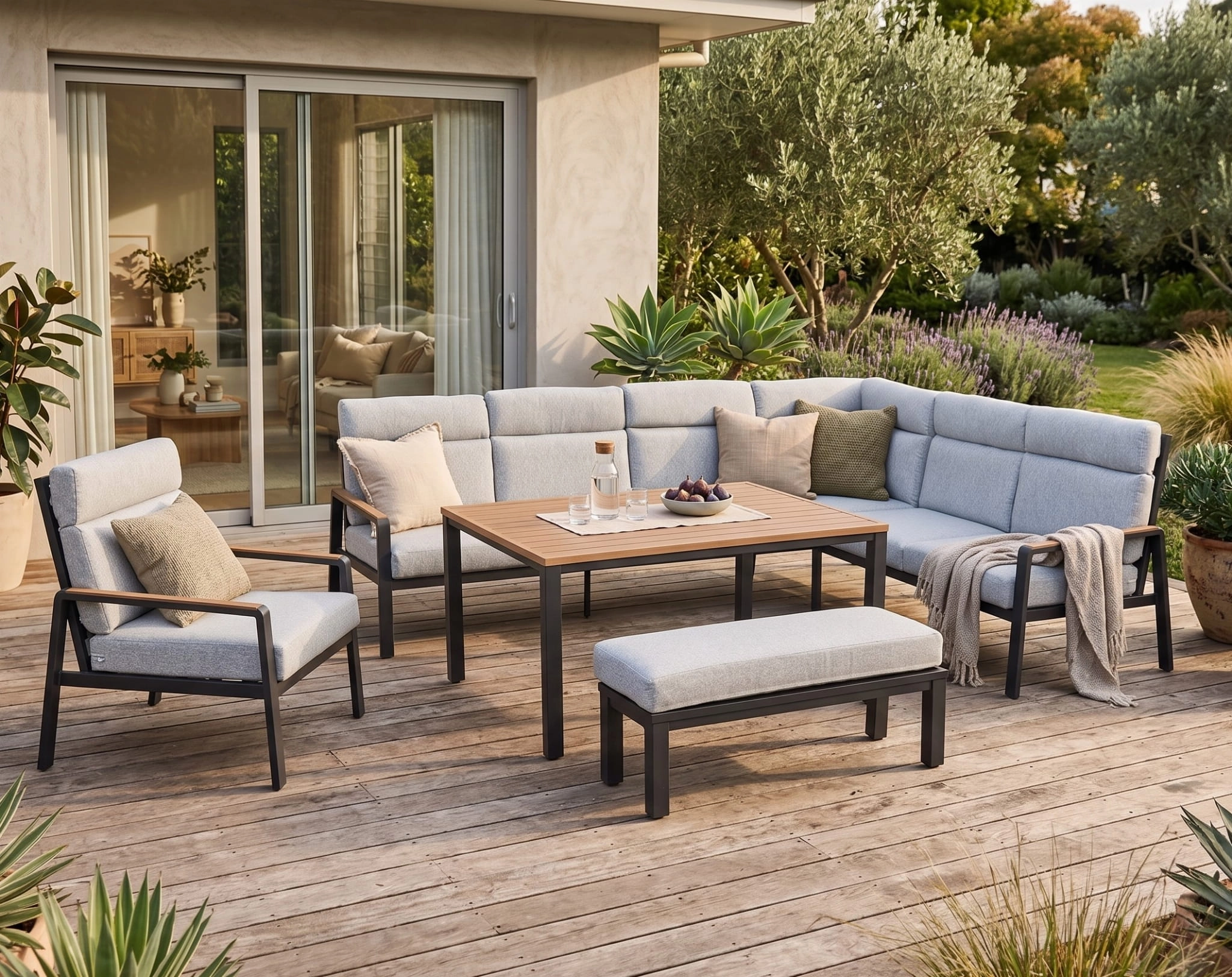 Masz taras, ale trudno stworzyć na nim miejsce, które będzie jednocześnie wygodne, uporządkowane i praktyczne przy większej liczbie gości? Często kończy się to dostawianiem przypadkowych krzeseł, zbyt małym stołem i aranżacją, która nie wygląda spójnie. ASTON rozwiązuje ten problem jako komplet wypoczynkowy do ogrodu, który łączy narożnik, fotel, ławeczkę i stół w jednej gotowej strefie.