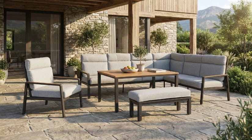 Szara tapicerka poduszek ma uniwersalny charakter, dlatego dobrze sprawdza się w nowoczesnych aranżacjach outdoorowych. Łączy się z czarnym stelażem, brązowym blatem, zielenią roślin i dodatkami w odcieniach drewna, grafitu lub beżu. Dzięki temu łatwo stworzyć nowoczesny taras przy domu, który wygląda spójnie i jest gotowy na codzienny odpoczynek.
