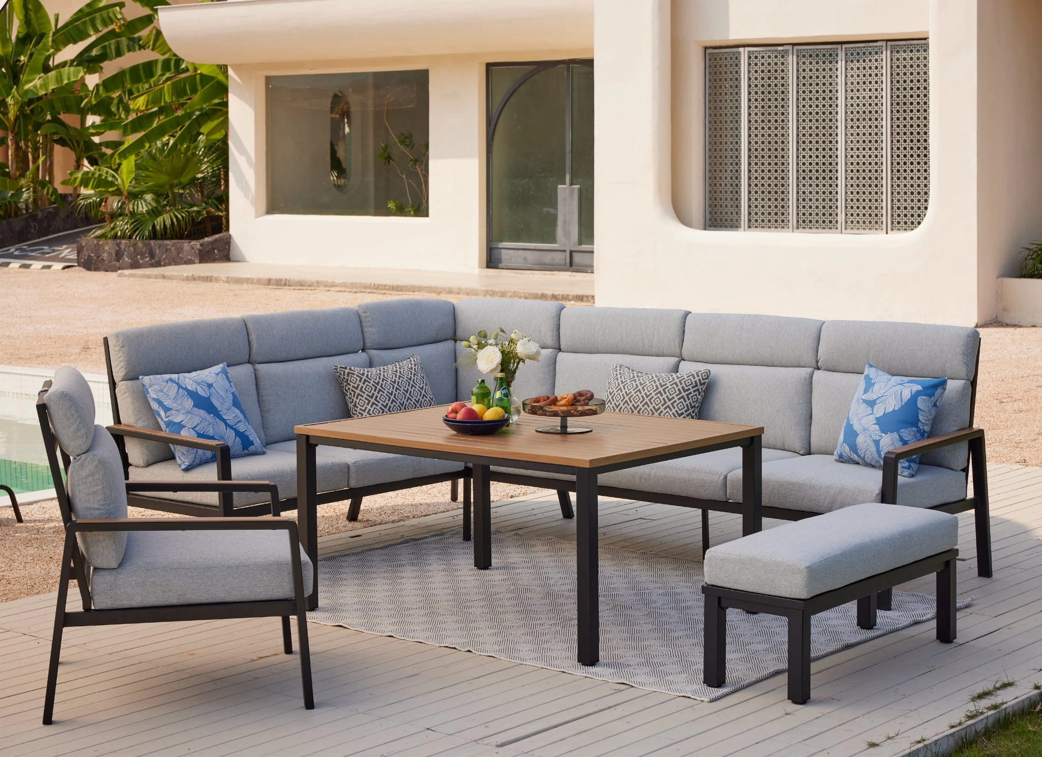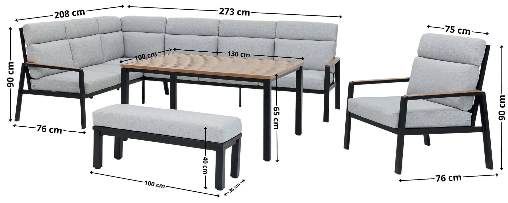 ASTON to zestaw mebli ogrodowych, który pozwala stworzyć wygodną przestrzeń do odpoczynku, posiłków i spotkań z bliskimi. Prawostronny układ narożnika pomaga dobrze wykorzystać narożnik tarasu, a kompletna konfiguracja ze stołem, fotelem i ławeczką sprawia, że od razu zyskujesz gotową strefę relaksu. To praktyczne meble tarasowe dla 8–10 osób, które dobrze sprawdzą się podczas rodzinnych obiadów, wieczornych rozmów i letnich przyjęć w ogrodzie.