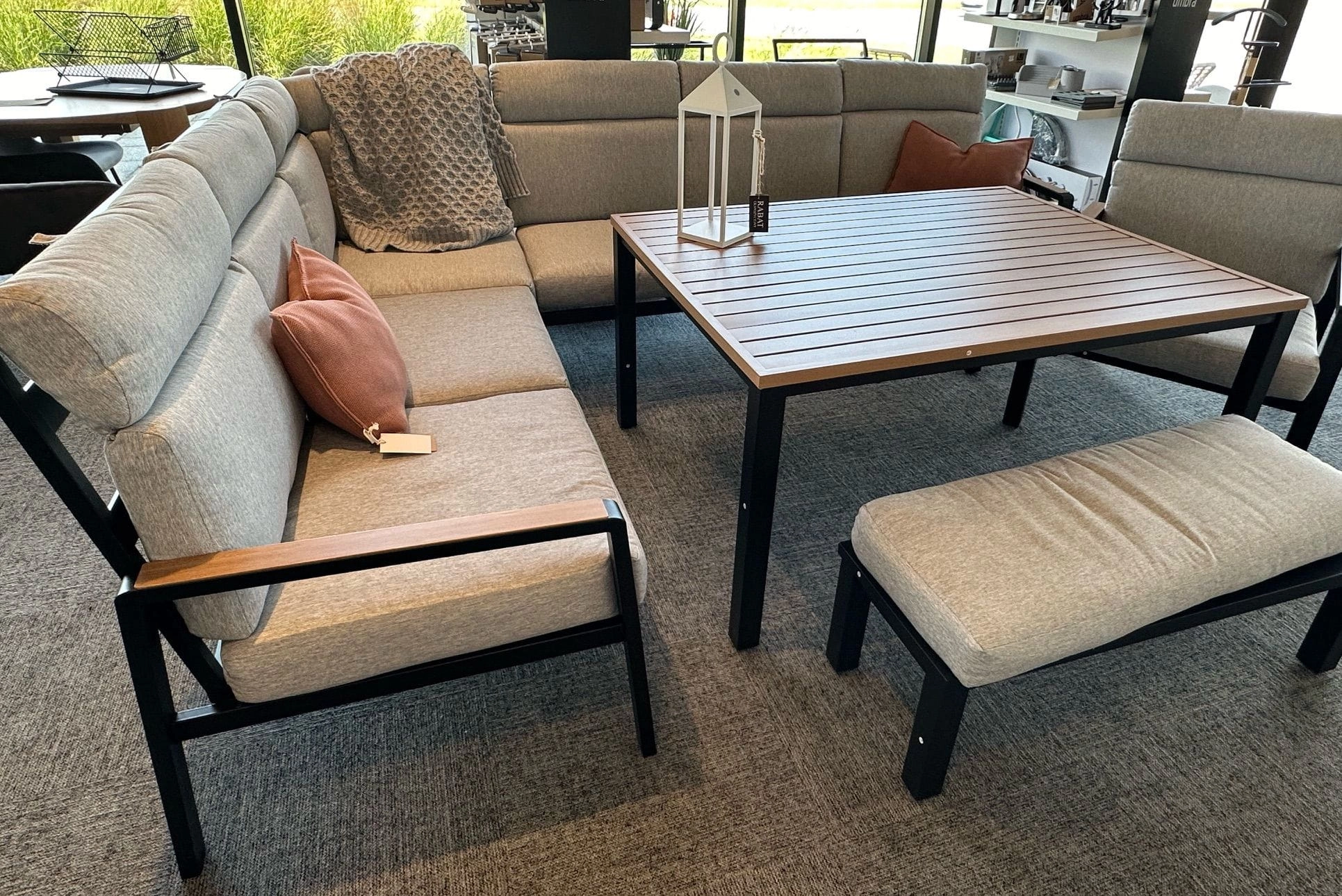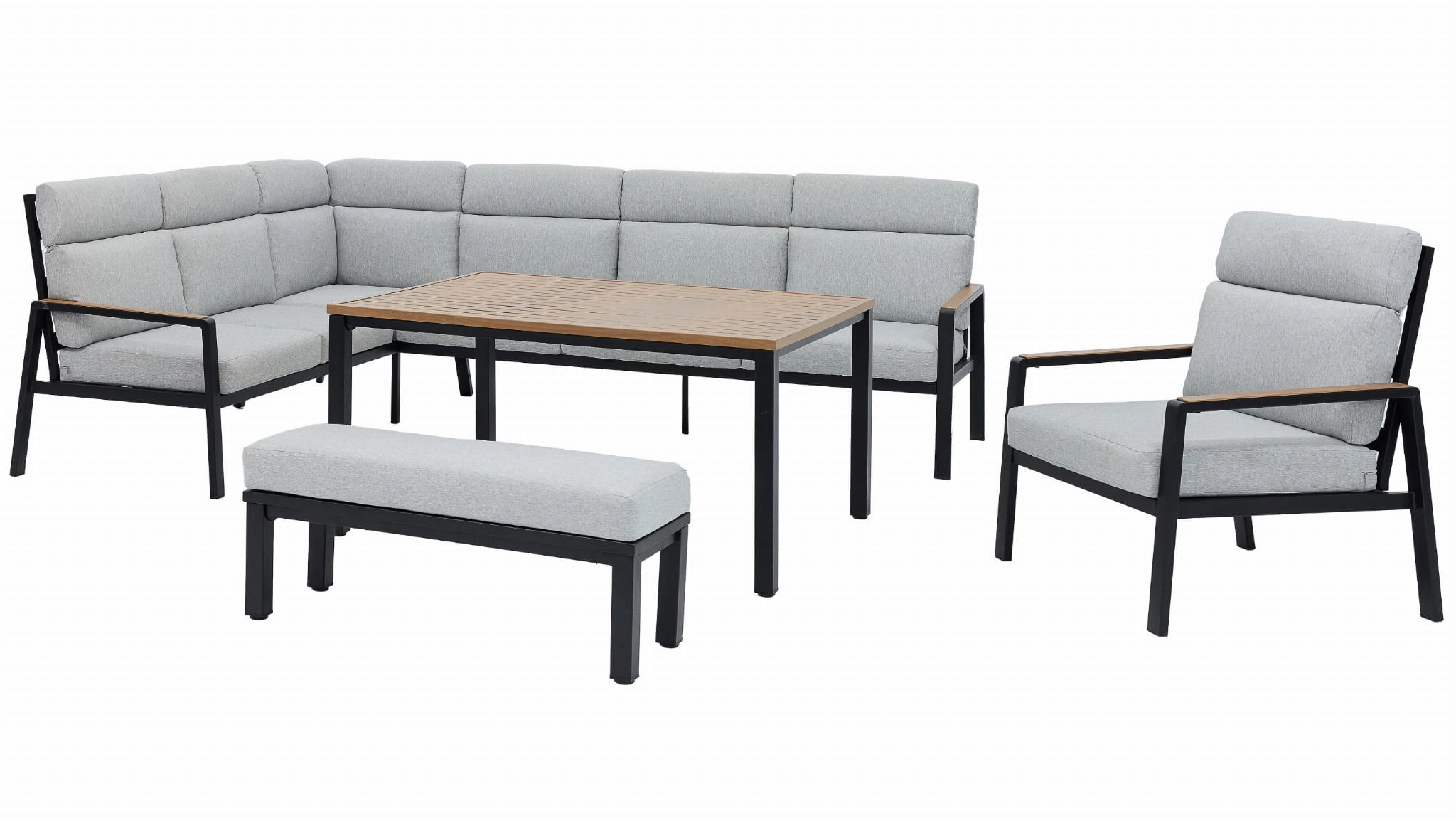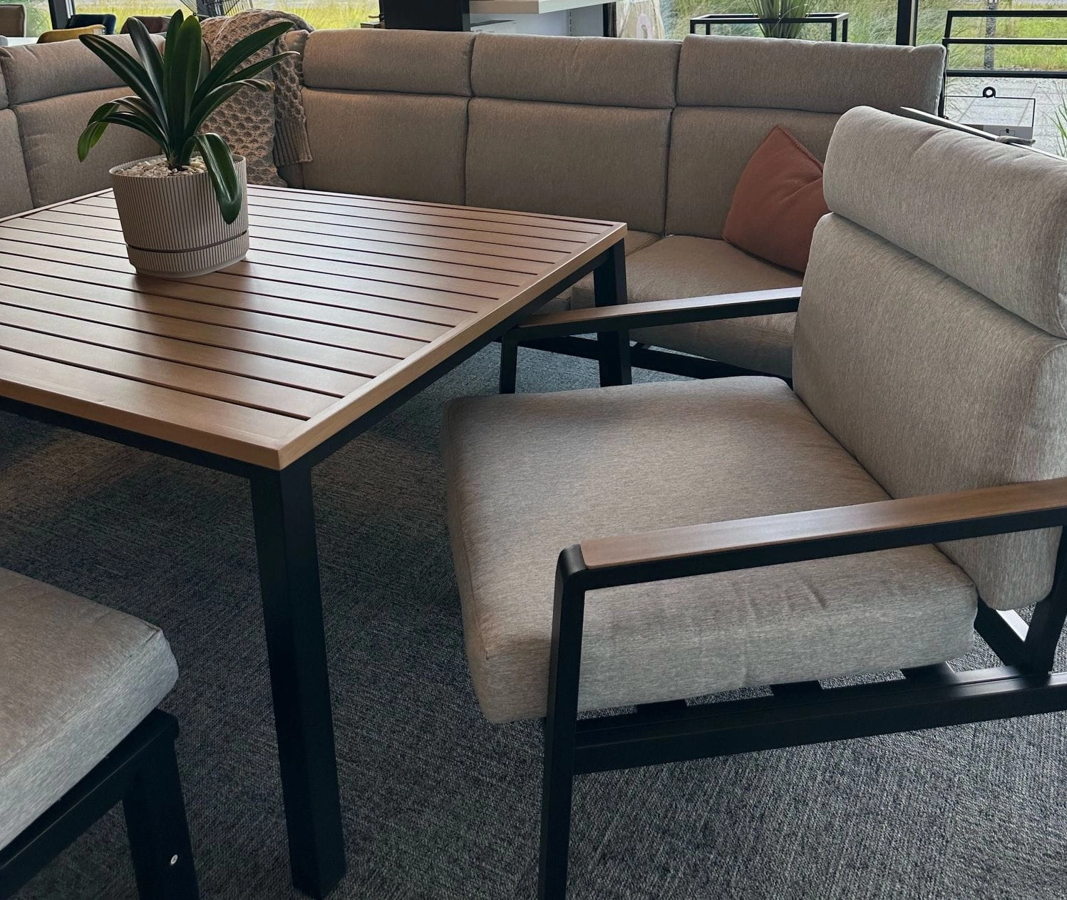 Grube poduszki zwiększają komfort siedzenia, a zdejmowane pokrowce na zamek ułatwiają utrzymanie tapicerki w czystości. Czarny metalowy stelaż i brązowy blat z wykończeniem imitującym drewno tworzą spójną bazę dla aranżacji outdoorowej, dzięki czemu narożnik ogrodowy ze stołem wygląda lekko, nowocześnie i przytulnie.