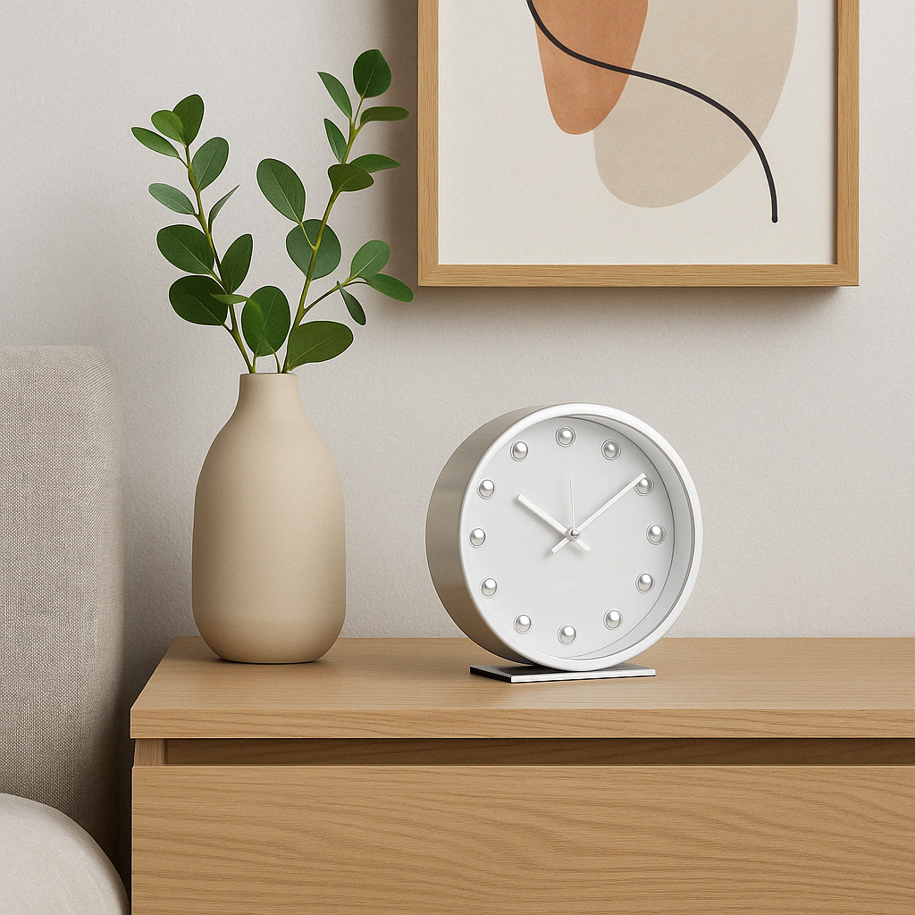 Umieszczony na komodzie w salonie, na toaletce lub kuchennym blacie stanie się eleganckim detalem, który nie tylko wskaże godzinę, ale również podkreśli estetykę pomieszczenia. To idealna propozycja dla osób, które cenią minimalistyczne formy i jakość wykonania.