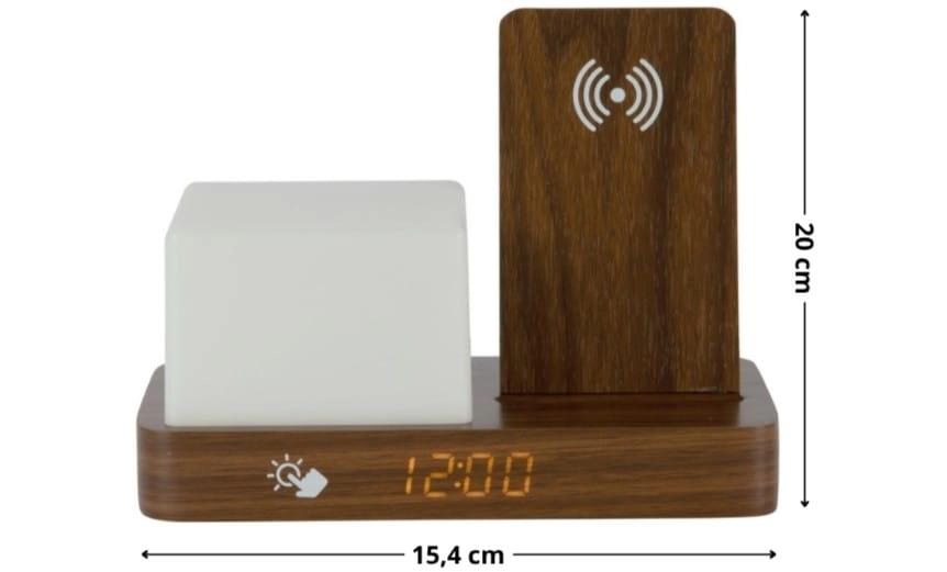 Wyobraź sobie swój stolik nocny: kłębowisko kabli od ładowarki, osobna lampka zajmująca połowę miejsca i budzik, którego cyfry rażą w oczy. Ten chaos nie sprzyja regeneracji. Problem plączących się przewodów i braku miejsca na odłożenie książki realnie wpływa na Twój komfort przed snem. Ten model to idealne rozwiązanie, które wprowadza poranny komfort i harmonię do Twojej prywatnej przestrzeni.