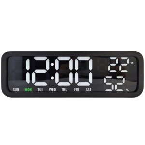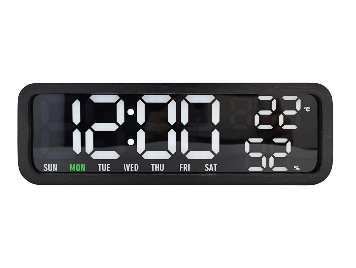 Wyobraź sobie biurko w stylu loft, na którym panuje idealny porządek. Obok monitora stoi czarny, matowy model o głębokiej strukturze drewna. Nie słyszysz irytującego tykania, które zwykle rozprasza podczas wielogodzinnej pracy przy biurku. Widzisz jedynie spokojny blask białych cyfr, informujący Cię, że jest poniedziałek – co potwierdza subtelny, zielony akcent na panelu. Nowoczesne biuro staje się miejscem pełnego skupienia.