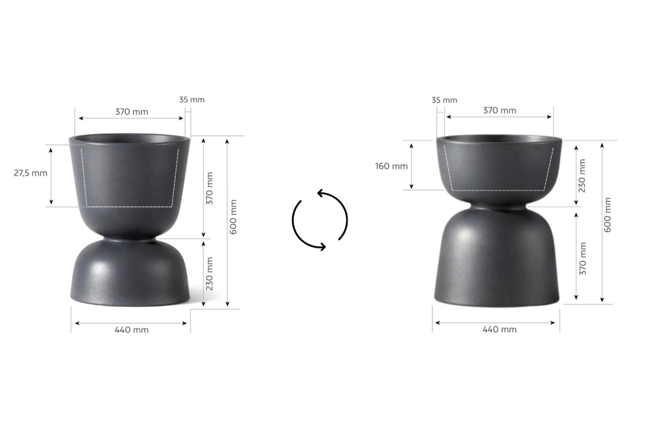 Donica Reverso 60 z wewnętrzną półką to propozycja dla osób, które chcą świadomie kształtować przestrzeń. Dwustronna forma pozwala zmieniać proporcje kompozycji bez konieczności wymiany donicy. To rozwiązanie inspirowane architekturą modułową, w której forma dopasowuje się do funkcji.