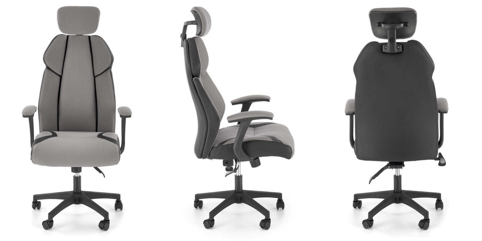 Fotel obrotowy CHRONO to połączenie funkcjonalności i elegancji, które sprawdzi się w każdym biurze lub domowym gabinecie. Wyposażony w mechanizm multiblock oraz regulowany zagłówek, zapewnia wygodę i zdrową postawę nawet podczas wielogodzinnej pracy. Tapicerka z eco skóry w modnym popielato-czarnym kolorze nadaje fotelowi prestiżowego charakteru, a kauczukowe kółka chronią podłogę przed zarysowaniami.