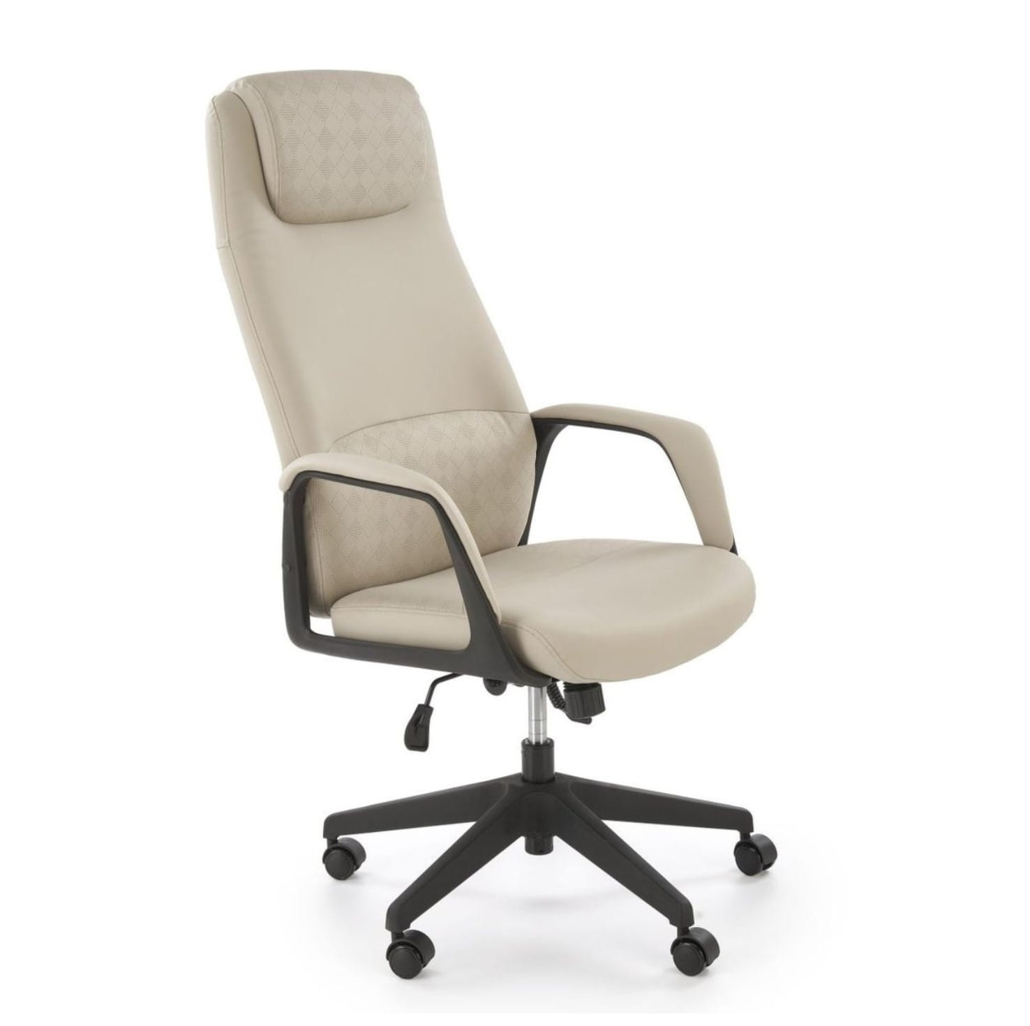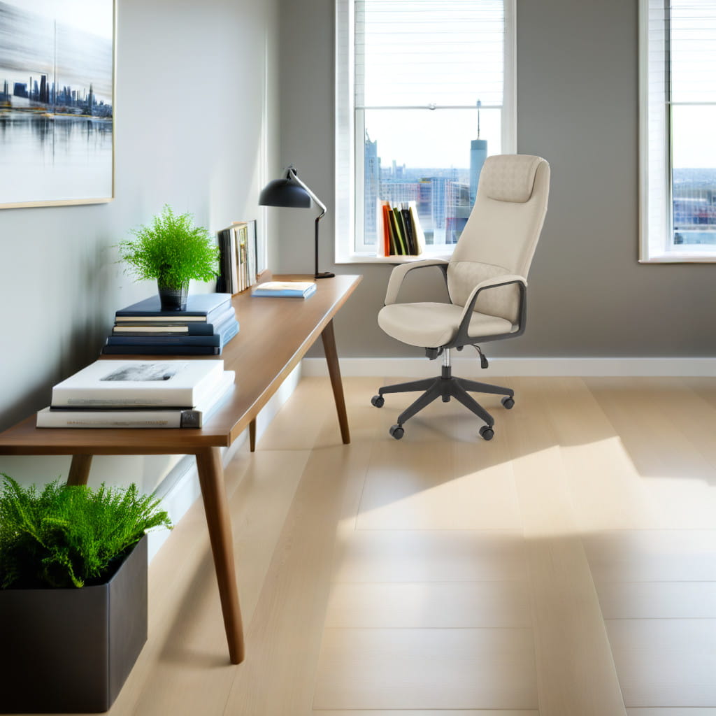 Tapicerka z wysokiej jakości ekoskóry prezentuje się elegancko i jest łatwa do utrzymania w czystości. Neutralny kolor beżowy pasuje do większości aranżacji – od nowoczesnych po klasyczne. Kauczukowe kółka zapewniają cichy i płynny ruch, nie rysując powierzchni podłogi – świetne rozwiązanie do mieszkań i biur z panelami lub parkietem.