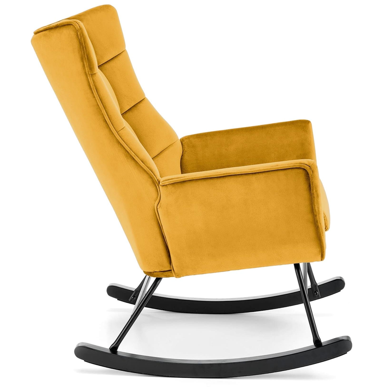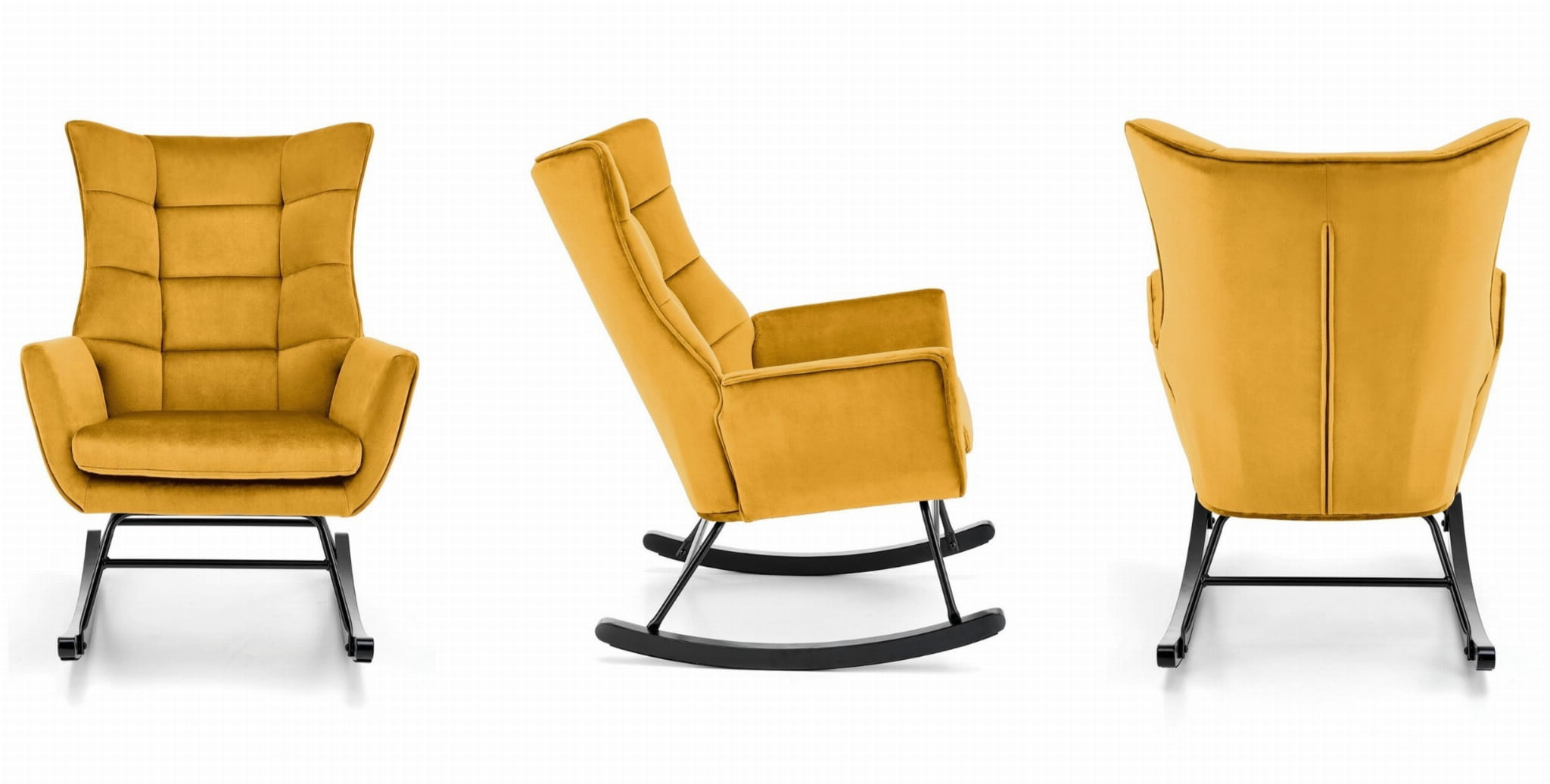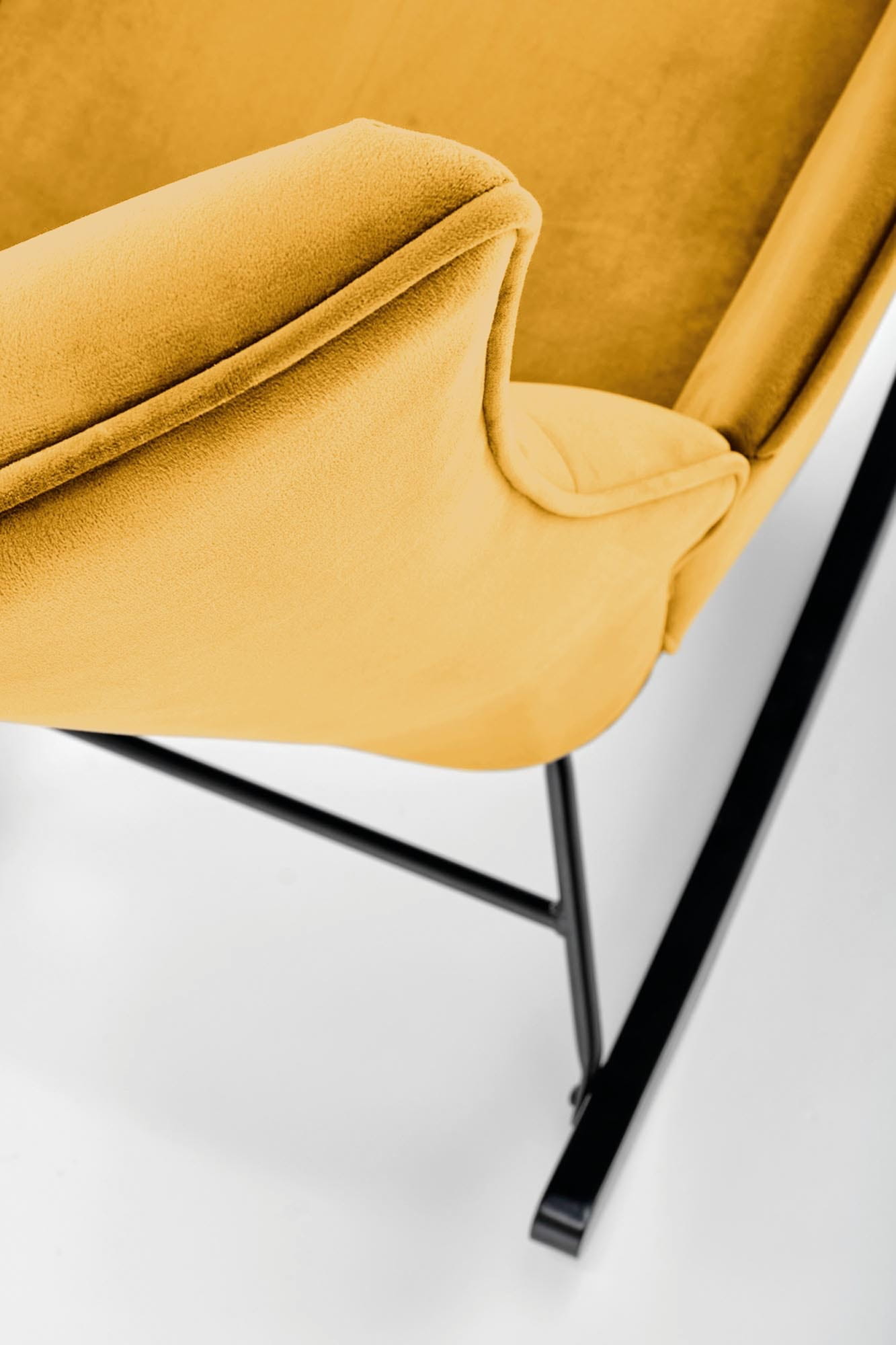 Musztardowy odcień tkaniny pięknie komponuje się z drewnianymi elementami i czarnym stelażem, dlatego fotel doskonale prezentuje się zarówno w jasnych, skandynawskich aranżacjach, jak i w bardziej wyrazistych, loftowych przestrzeniach. Ten fotel bujany na płozach świetnie sprawdzi się jako fotel do czytania, fotel do karmienia czy po prostu Twoje ulubione miejsce relaksu po długim dniu.