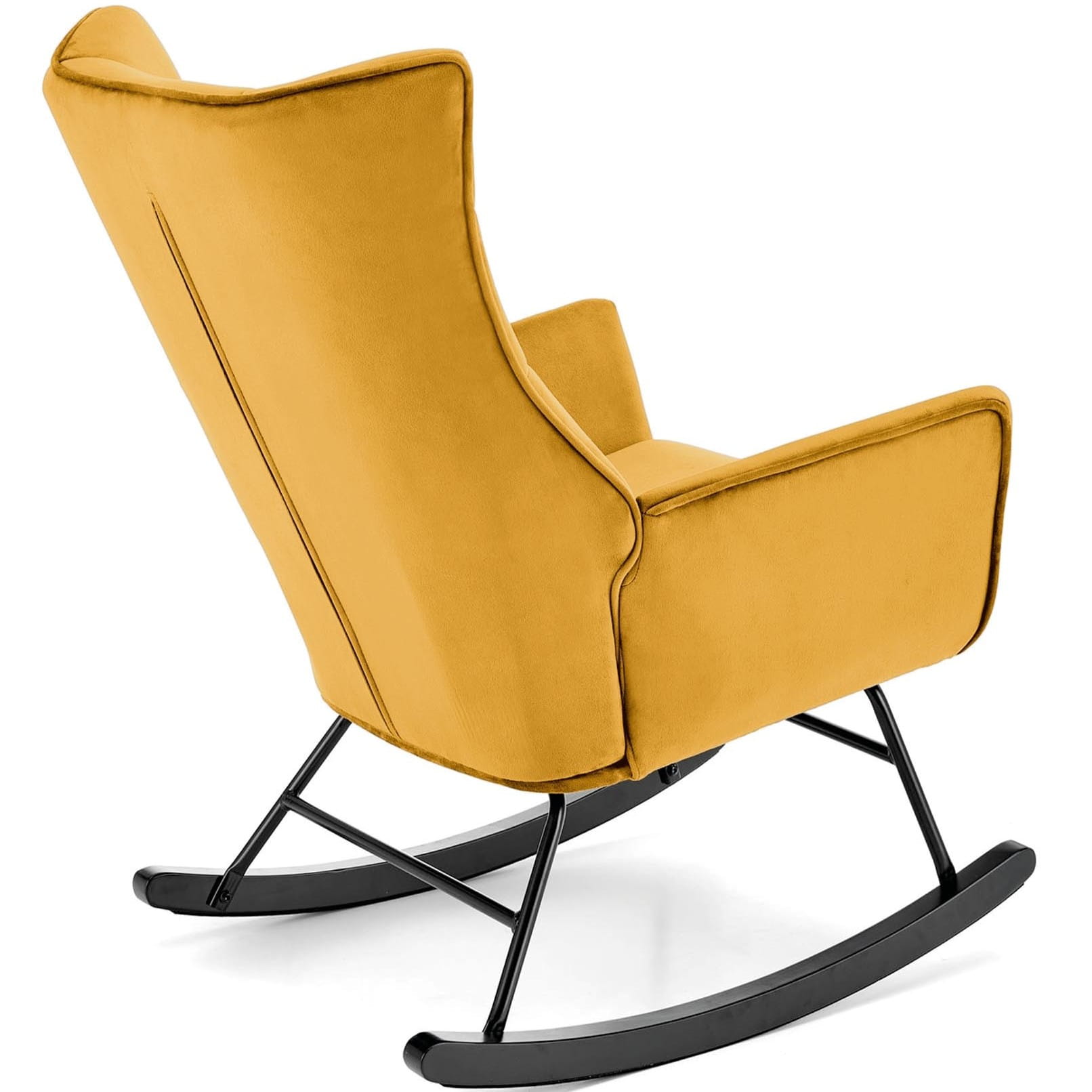 Dzięki kompaktowym wymiarom fotel świetnie wpisuje się zarówno w większe salony, jak i mniejsze przestrzenie, gdzie liczy się każdy metr. To doskonały fotel bujany do salonu, przytulnej sypialni czy kącika do czytania przy oknie. Musztardowa tapicerka typu velvet pięknie współgra z naturalnym drewnem płóz i czarnym stelażem, tworząc modny zestaw pasujący do wnętrz w stylu skandynawskim, boho, nowoczesnym, a nawet lekko industrialnym.