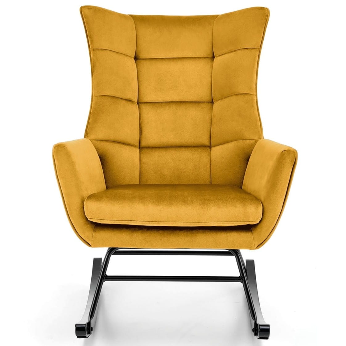- Nowoczesny design – musztardowy fotel bujany pięknie uzupełnia modne aranżacje w stylu scandi, boho i modern