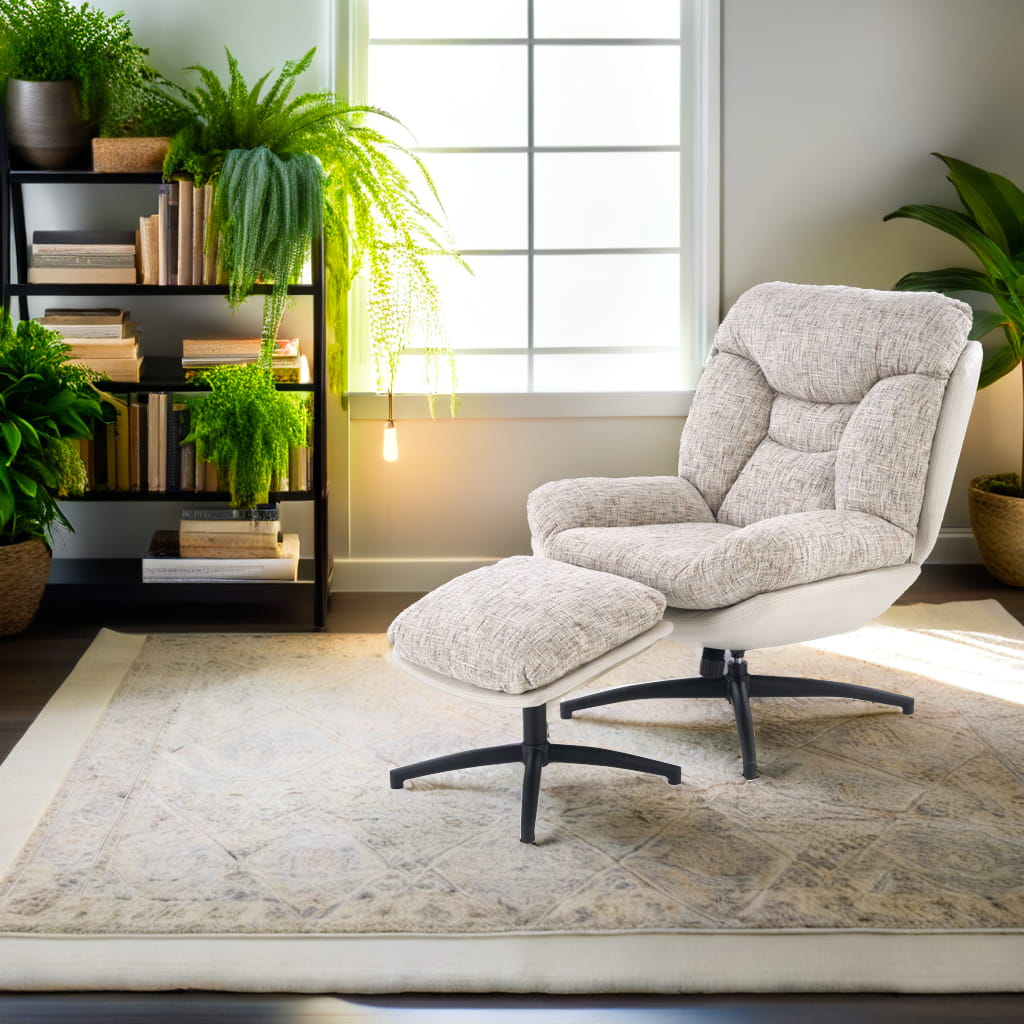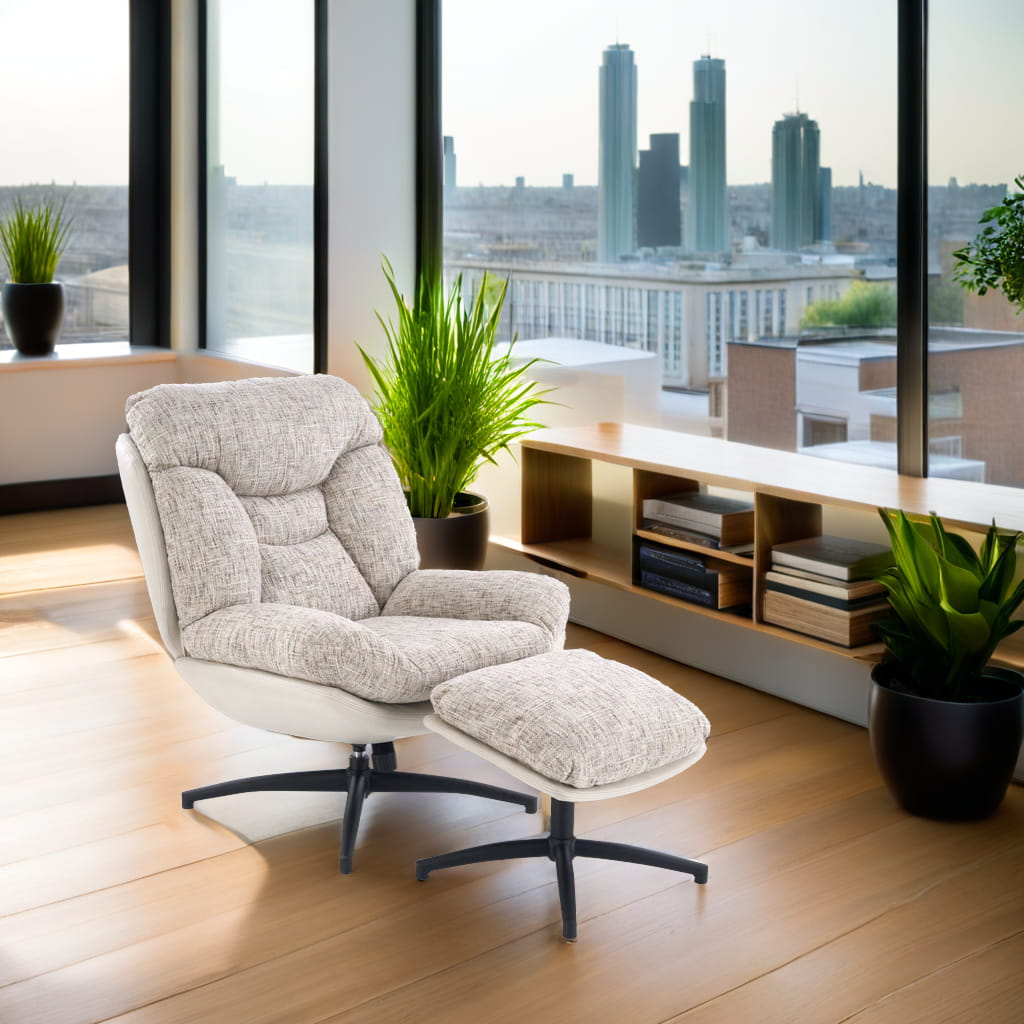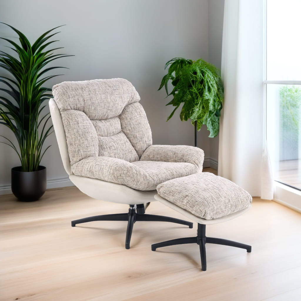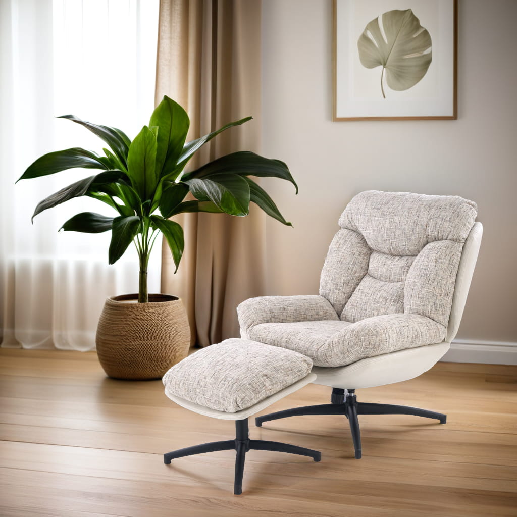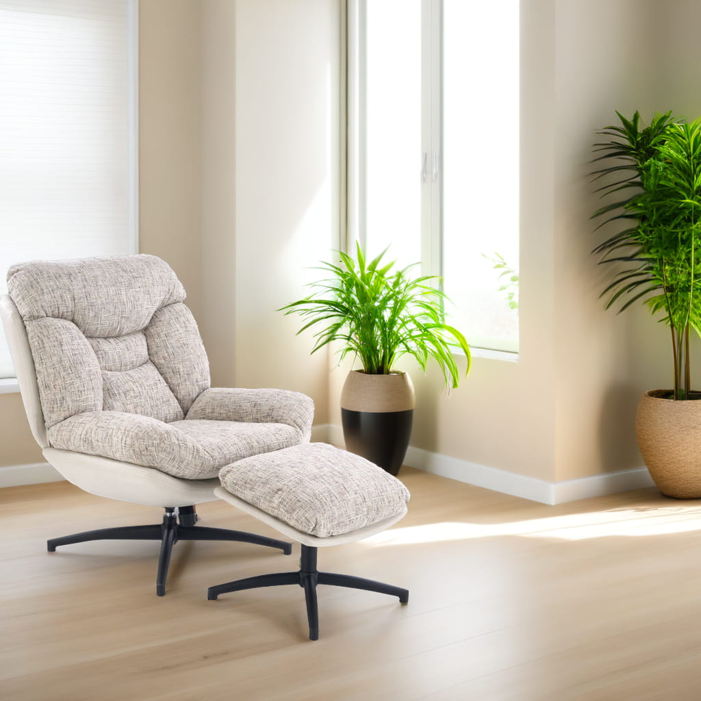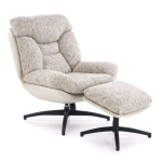 Fotel obrotowy z podnóżkiem KRONOS to połączenie wygody, estetyki i funkcjonalności. Dzięki wyjątkowemu designowi i komfortowej formie, doskonale sprawdzi się jako fotel do odpoczynku, relaksu czy czytania. Beżowa tapicerka z ciekawym akcentem kolorystycznym oraz czarny, stabilny stelaż tworzą harmonijną całość, która wpasuje się w nowoczesne aranżacje.