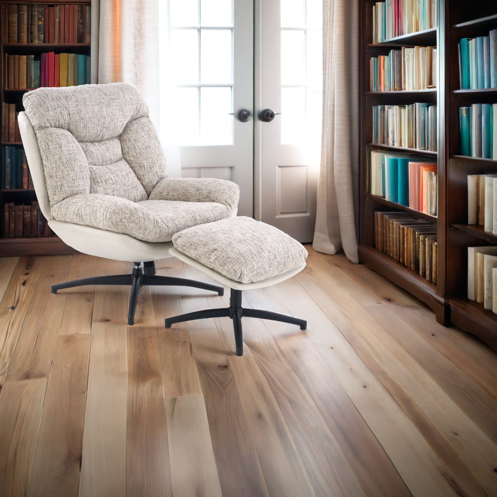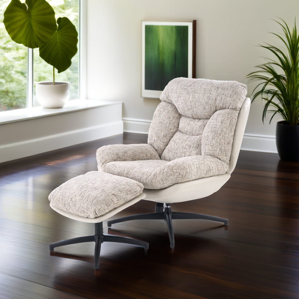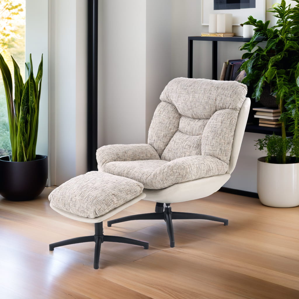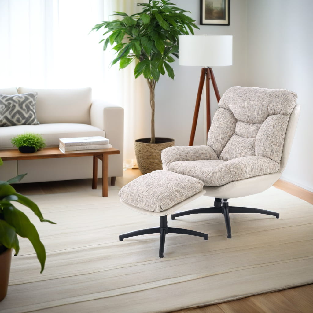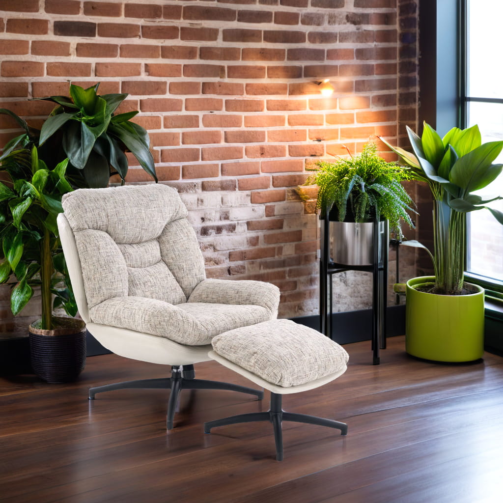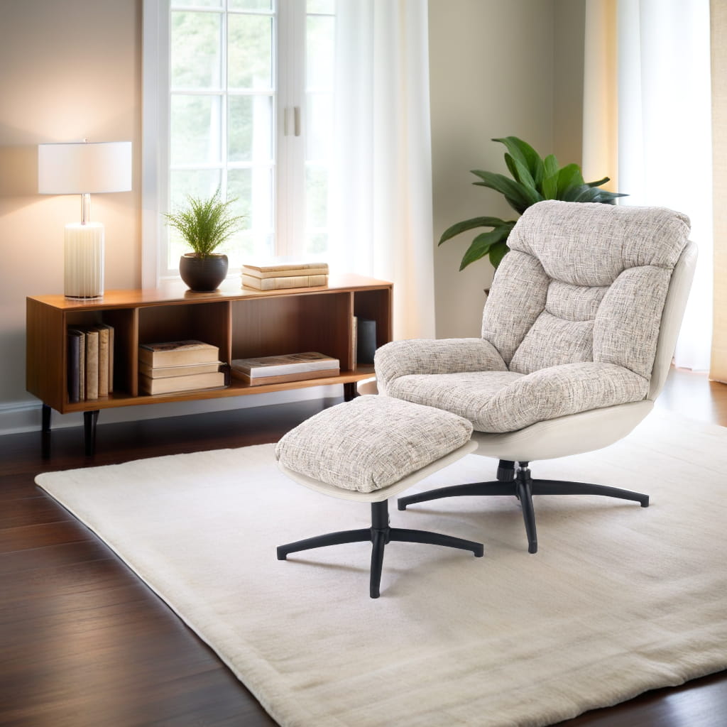 Fotel obrotowy z podnóżkiem KRONOS to połączenie wygody, estetyki i funkcjonalności. Dzięki wyjątkowemu designowi i komfortowej formie, doskonale sprawdzi się jako fotel do odpoczynku, relaksu czy czytania. Beżowa tapicerka z ciekawym akcentem kolorystycznym oraz czarny, stabilny stelaż tworzą harmonijną całość, która wpasuje się w nowoczesne aranżacje.