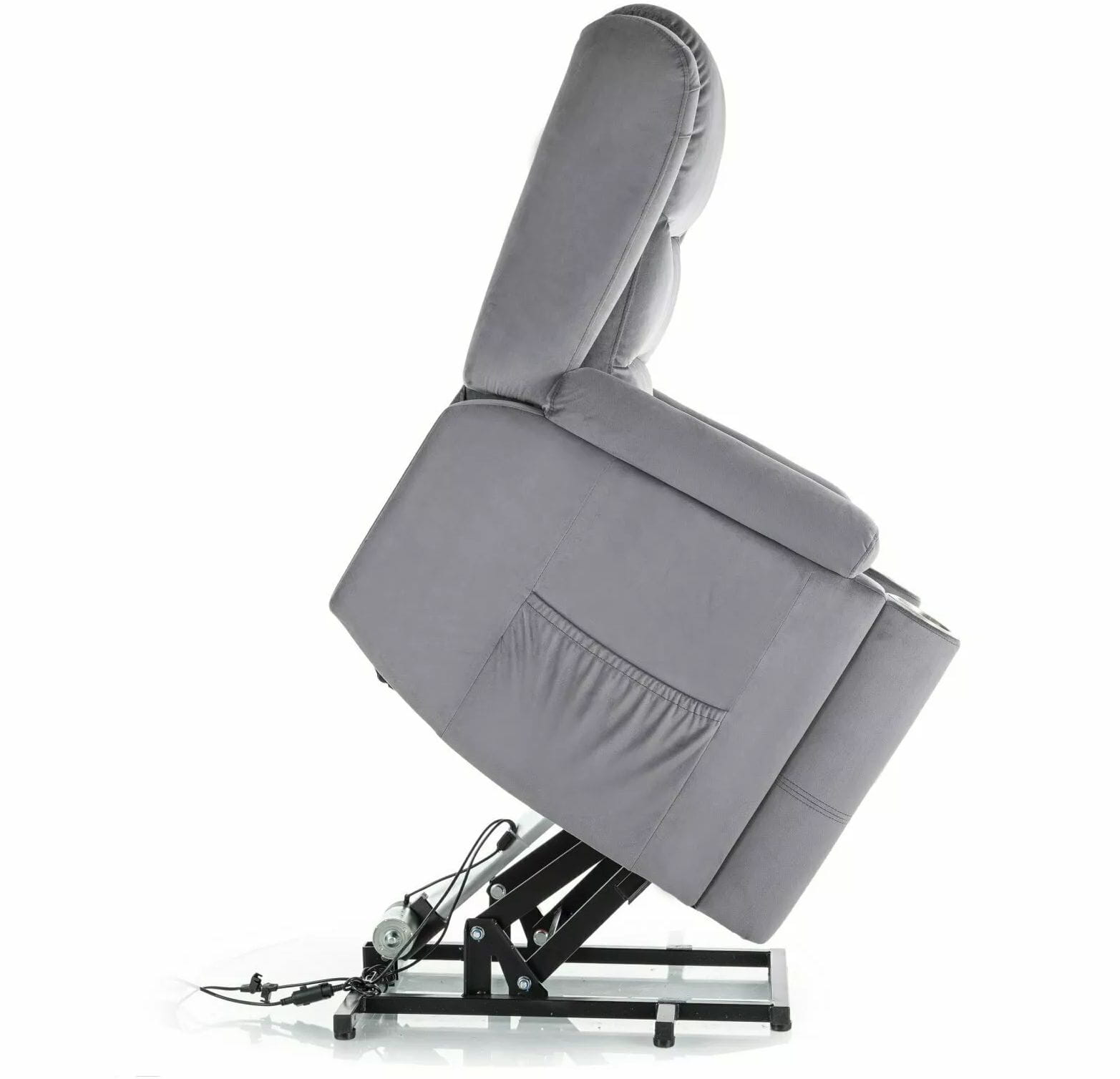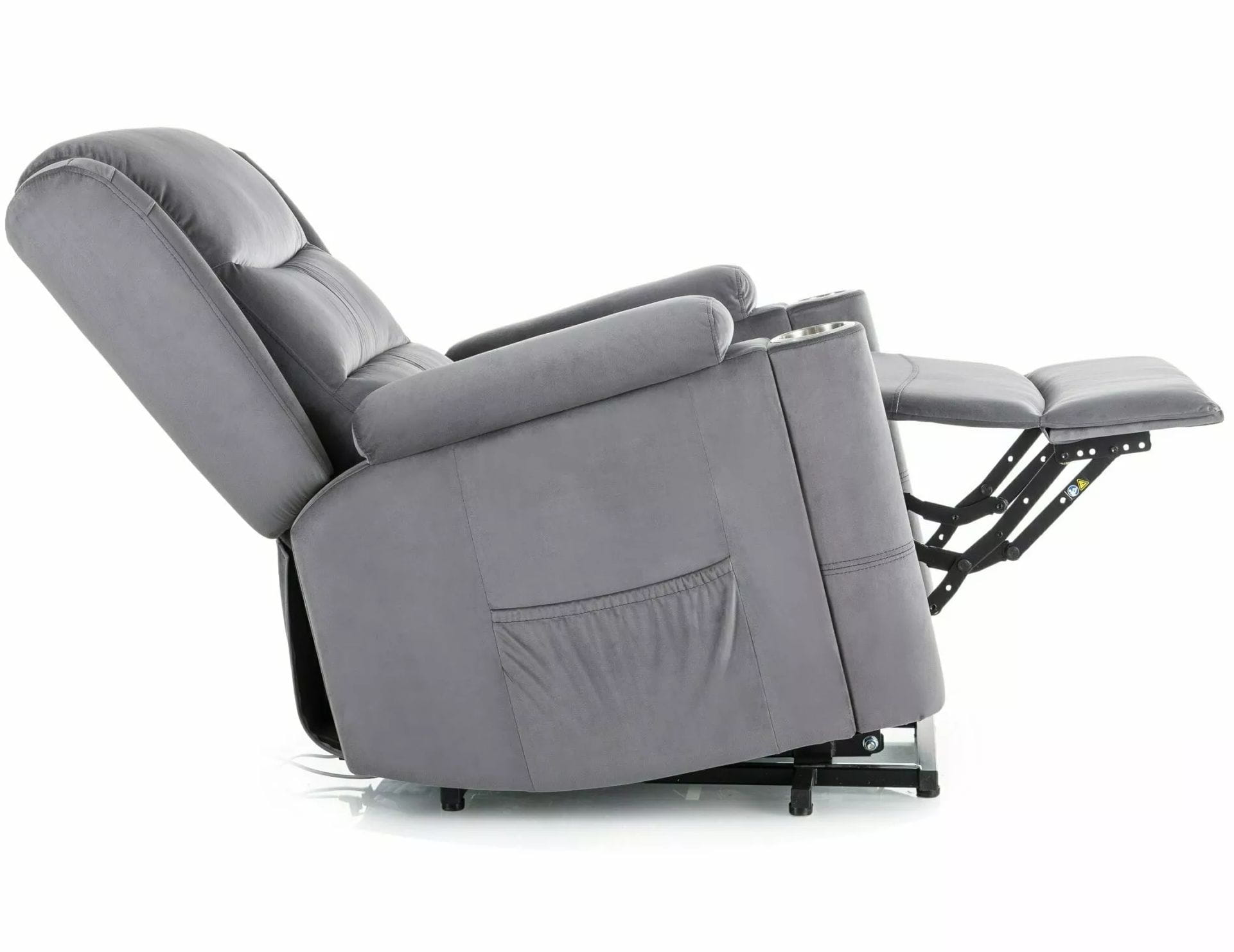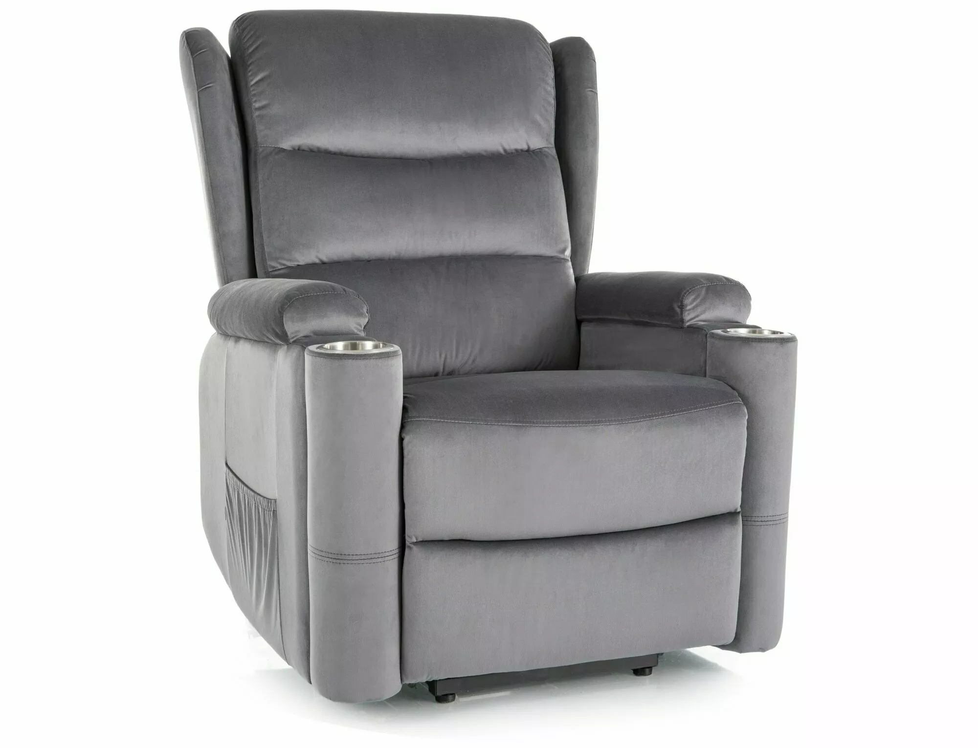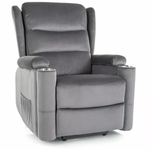 Szara welurowa tapicerka wprowadza elegancję i przytulność do wnętrza, a czarna, metalowa podstawa zapewnia nie tylko trwałość, ale też nowoczesny, stylowy wygląd. Praktyczne detale, takie jak uchwyt na kubek i boczna kieszeń, czynią z tego modelu idealnego towarzysza do popołudniowego relaksu, seansu filmowego czy lektury książki.