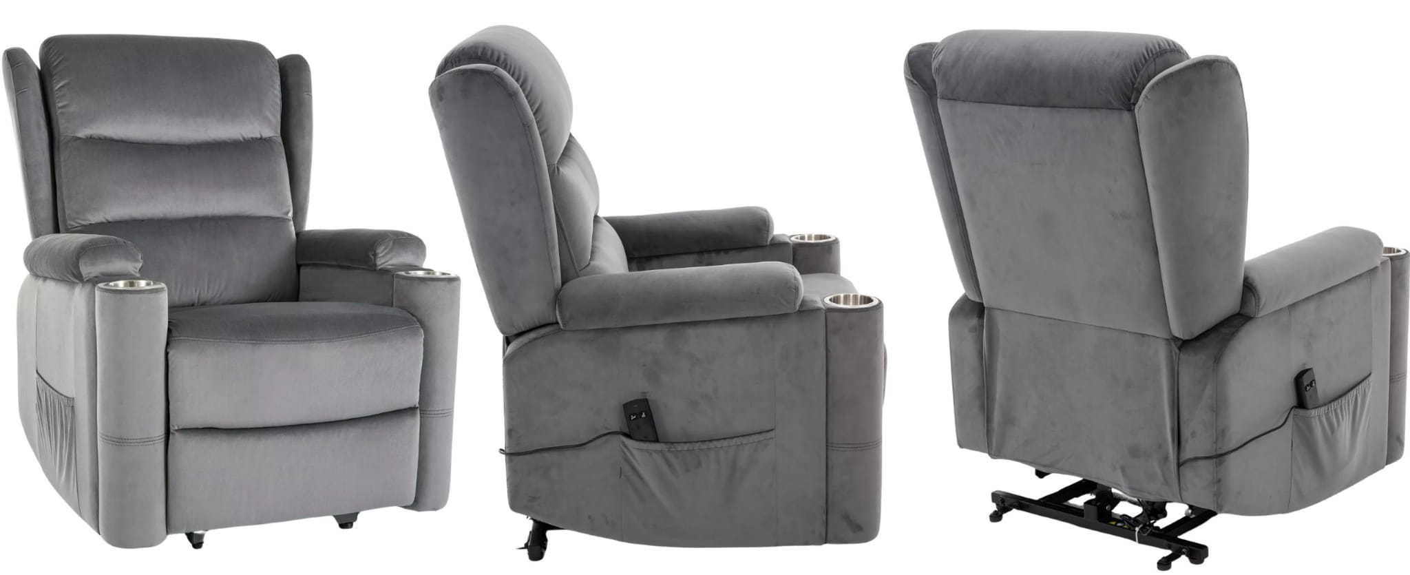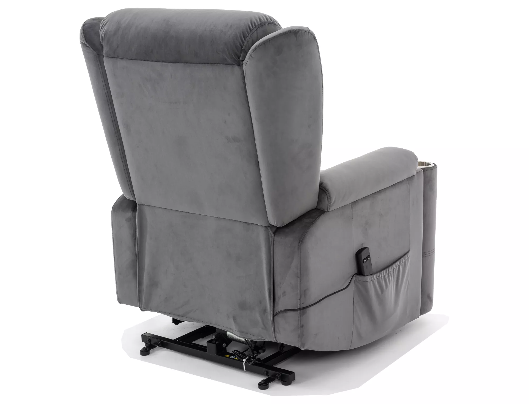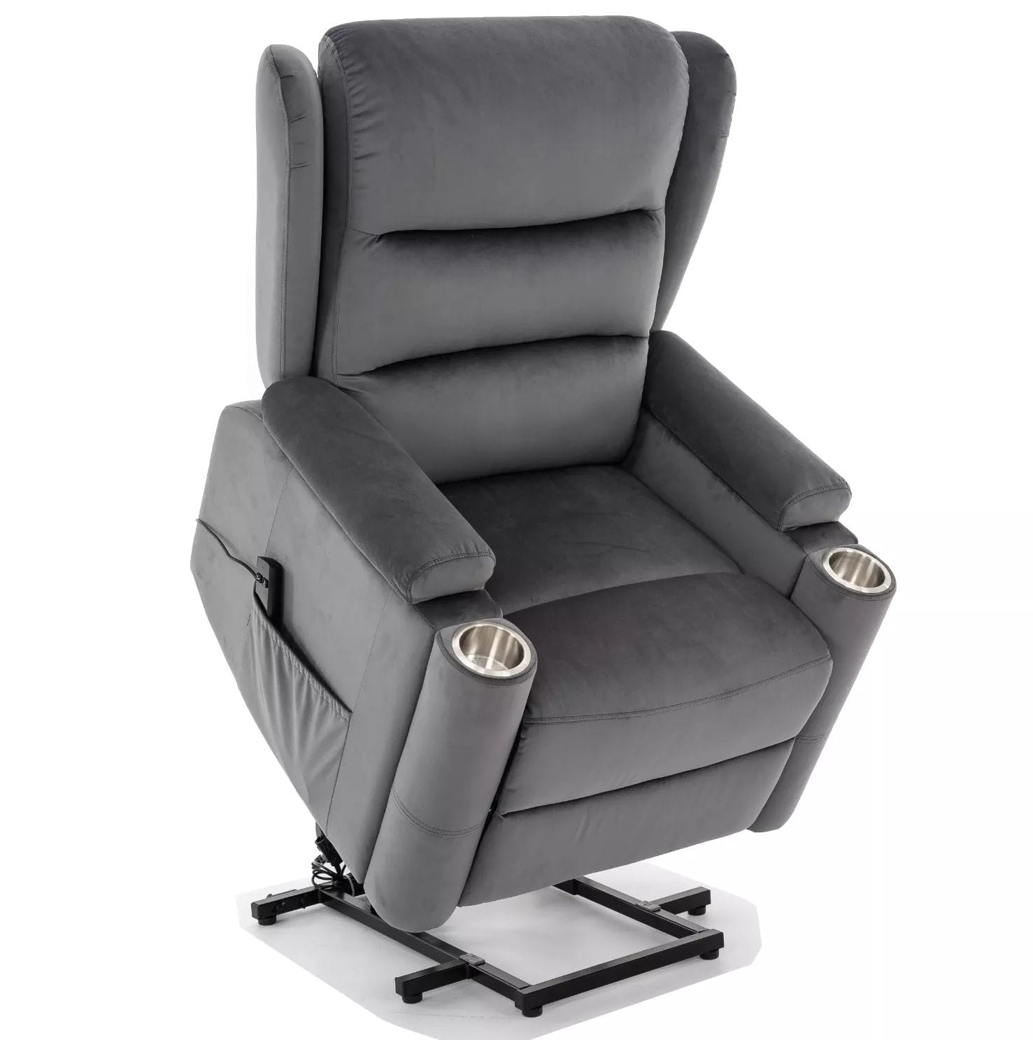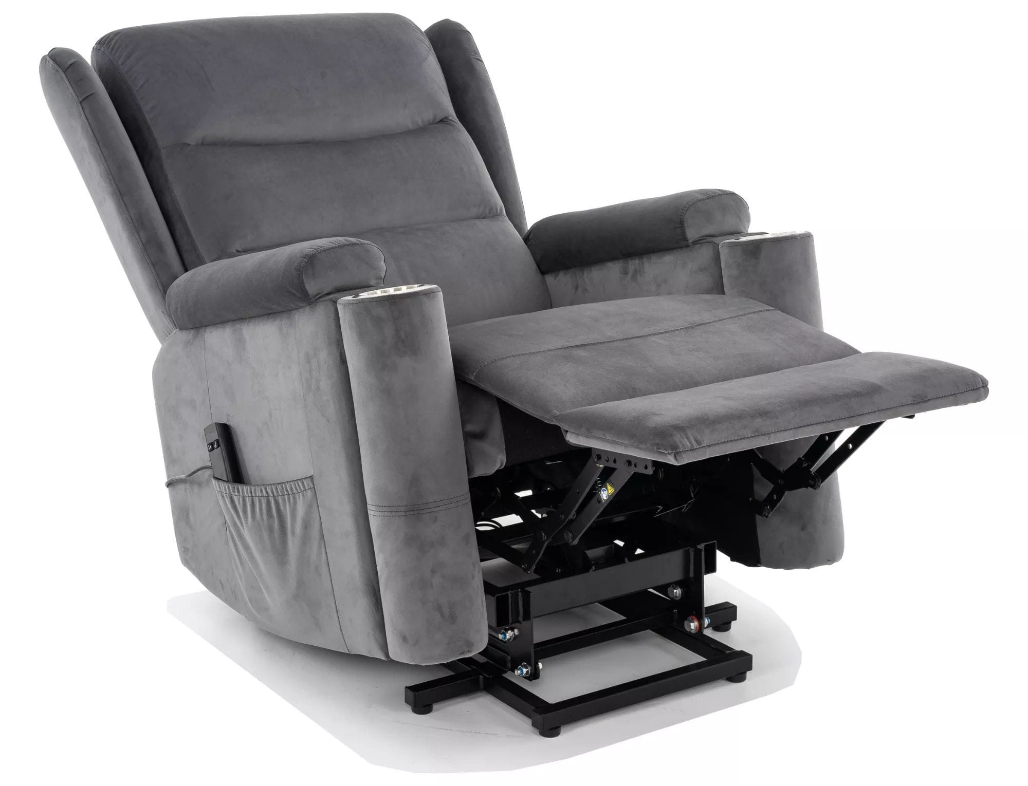 Szara welurowa tapicerka wprowadza elegancję i przytulność do wnętrza, a czarna, metalowa podstawa zapewnia nie tylko trwałość, ale też nowoczesny, stylowy wygląd. Praktyczne detale, takie jak uchwyt na kubek i boczna kieszeń, czynią z tego modelu idealnego towarzysza do popołudniowego relaksu, seansu filmowego czy lektury książki.
