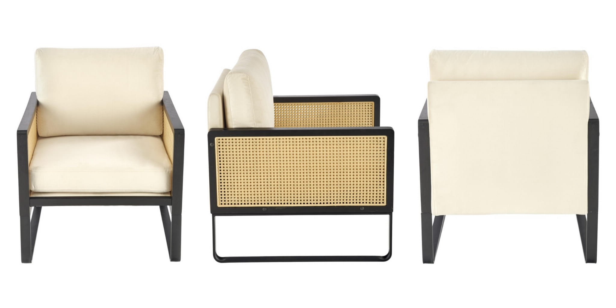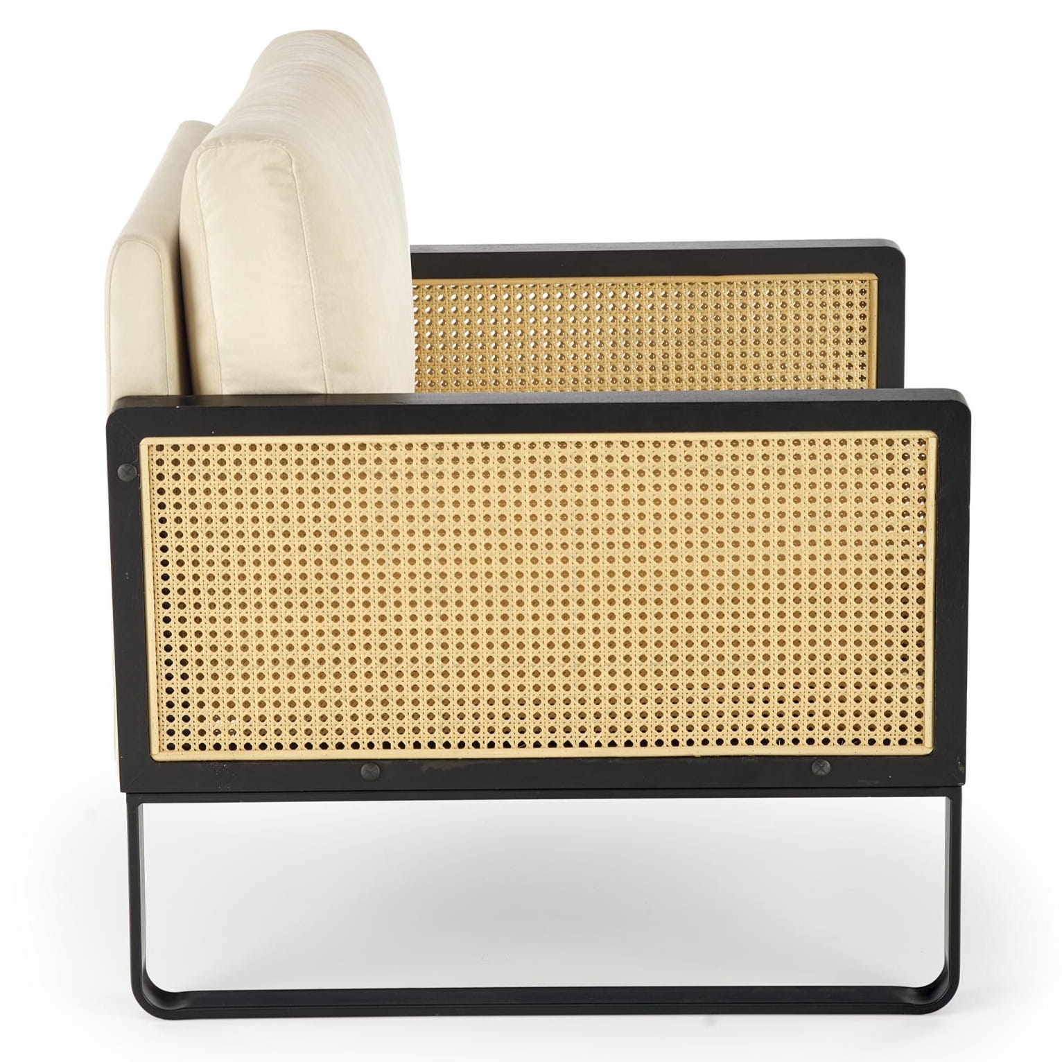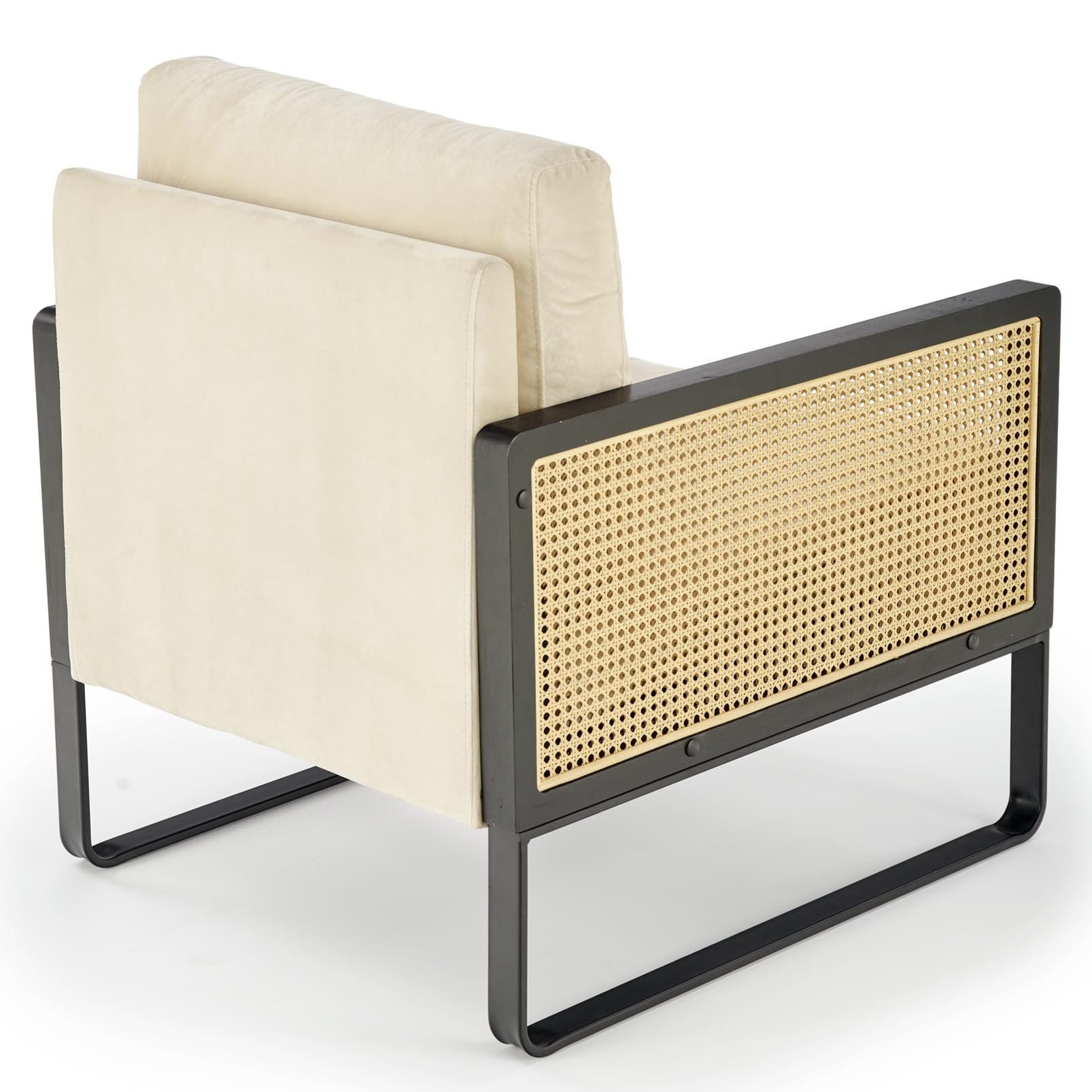 Fotel wypoczynkowy ILARIO rattan, velvet jasny beż to połączenie miękkiej w dotyku tapicerki velvet z modnymi, plecionymi elementami z rattanu syntetycznego oraz stabilnym stelażem z czarnej stali malowanej proszkowo. Naturalny charakter, jasna kolorystyka i lekkie wizualnie proporcje sprawiają, że to idealny fotel boho do salonu, który pięknie komponuje się z drewnem, lnianymi tekstyliami i dodatkami w stylu natury.