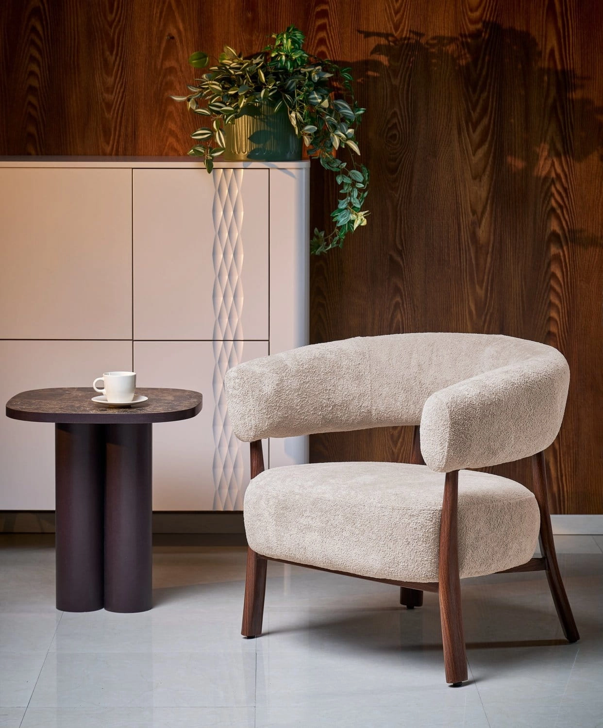 Ten nowoczesny fotel wypoczynkowy to coś więcej niż zwykłe siedzisko do salonu – to przemyślany projekt, który staje się centralnym punktem każdej strefy odpoczynku. Wykorzystany materiał o strukturze bouclé sprawia, że mebel tapicerowany zyskuje luksusowy charakter, a miękkie siedzisko zachęca do odpoczynku po intensywnym dniu. Dzięki swojej unikalnej formie, mebel ten wprowadza do pomieszczenia ład i harmonię, stając się inwestycją w Twój codzienny komfort.