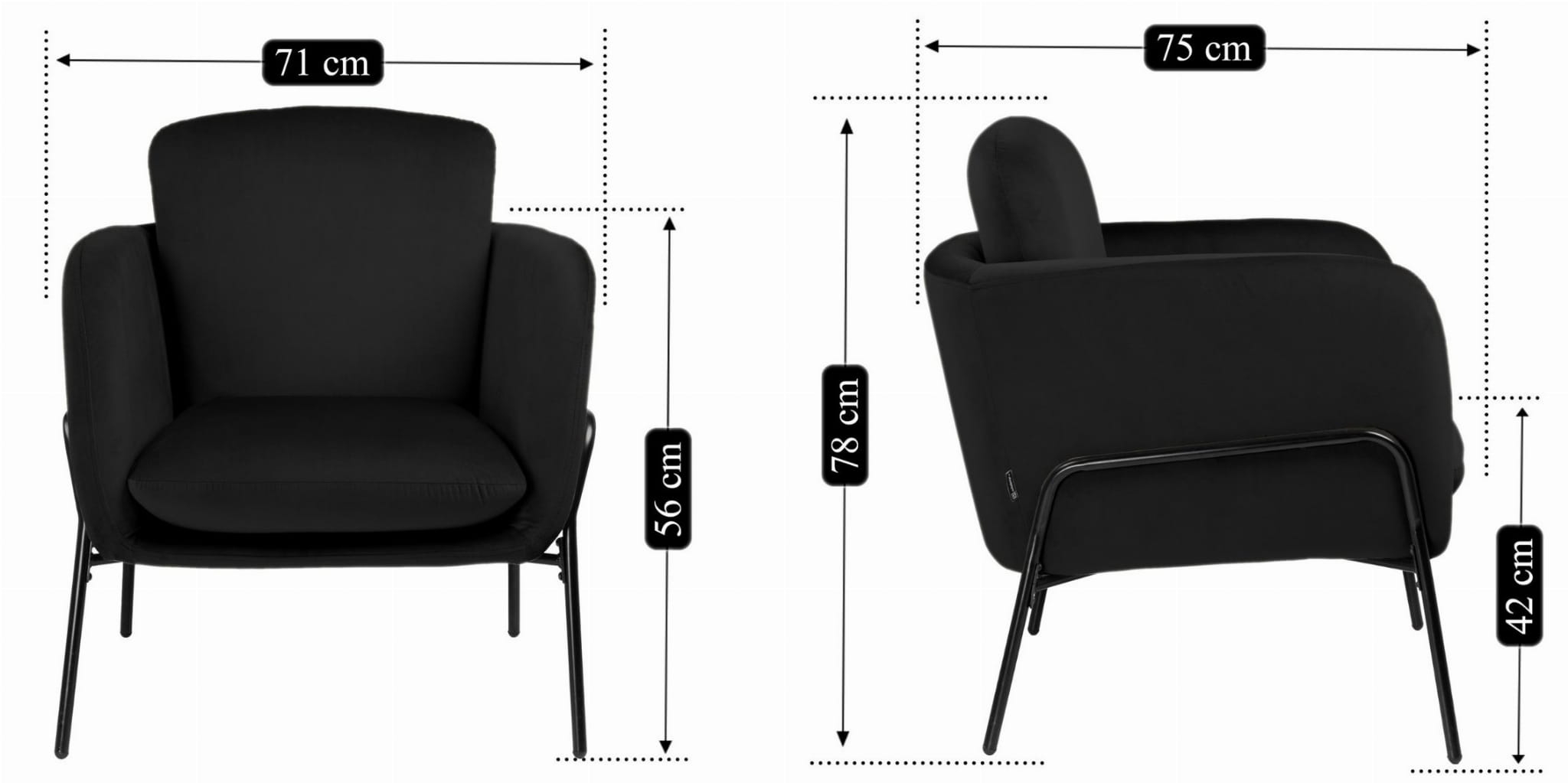 Fotel wypoczynkowy KORN to doskonały wybór dla osób, które cenią sobie wygodę, styl i funkcjonalność w jednym. Jego elegancka forma, wykończona czarnym, welurowym obiciem, wprowadza do wnętrza nutę luksusu i wyrafinowania. Metalowe nogi w czarnym kolorze nadają mu lekkości, a jednocześnie zapewniają stabilność.