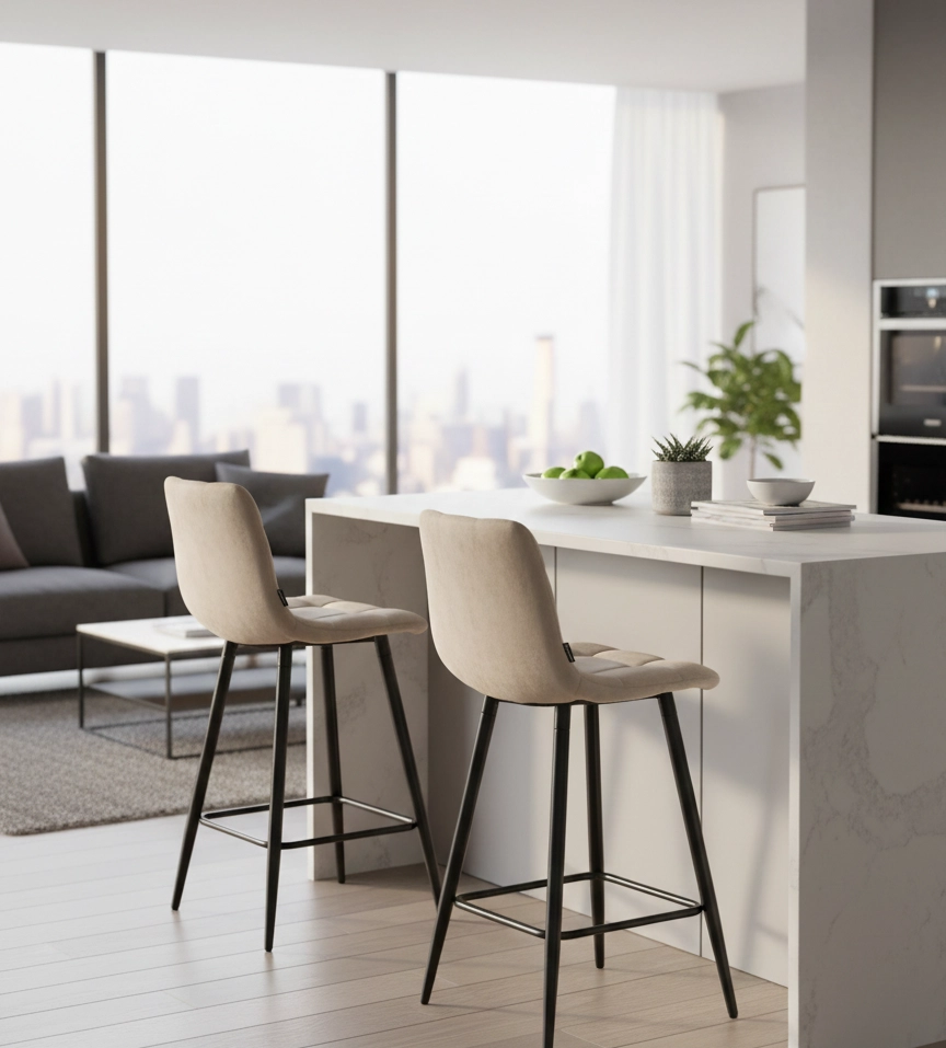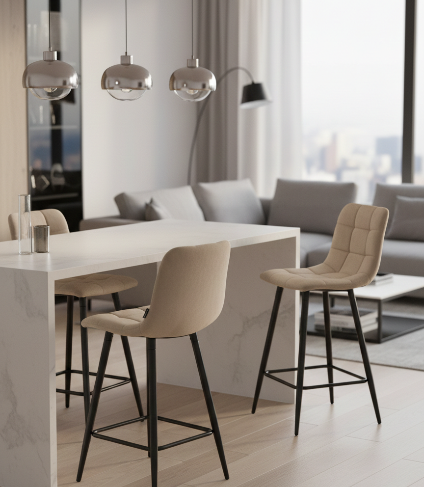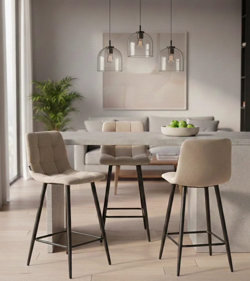 Hoker obrotowy TORE - S to połączenie elegancji, komfortu i funkcjonalności – idealne rozwiązanie do Twojej nowoczesnej kuchni lub jadalni. Beżowa tapicerka z miękkiego weluru oraz czarny, metalowy stelaż tworzą harmonijną kompozycję w stylu glamour i loft. Dzięki wysokości siedziska 65 cm doskonale sprawdzi się przy wyspie kuchennej lub wysokim stole, zapewniając wygodę użytkowania na co dzień i od święta. Szukasz krzesła barowego, które zachwyca nie tylko wyglądem, ale i funkcjonalnością? TORE - S to strzał w dziesiątkę!