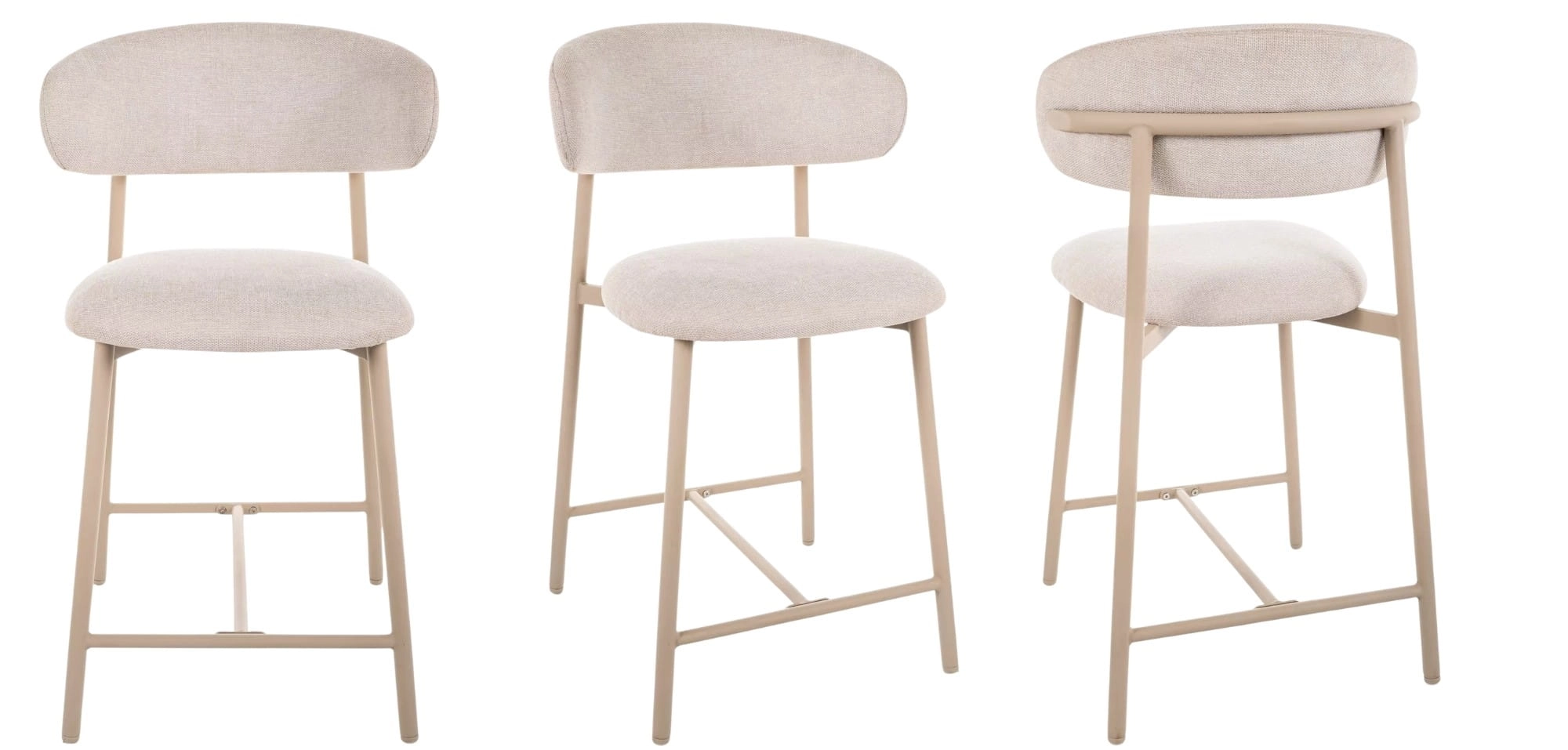 Ten półhoker do kuchni dobrze sprawdzi się w jasnych, przytulnych aranżacjach, w których liczą się miękkie linie i spokojne kolory. Jasnobeżowa tkanina dodaje wnętrzu ciepła, a kaszmirowe nogi tworzą delikatniejszy efekt niż klasyczna czerń. Dzięki temu model pasuje zarówno do kuchni z drewnianym blatem, jak i do nowoczesnej wyspy w kolorze bieli, kaszmiru, piaskowego beżu czy jasnego kamienia.