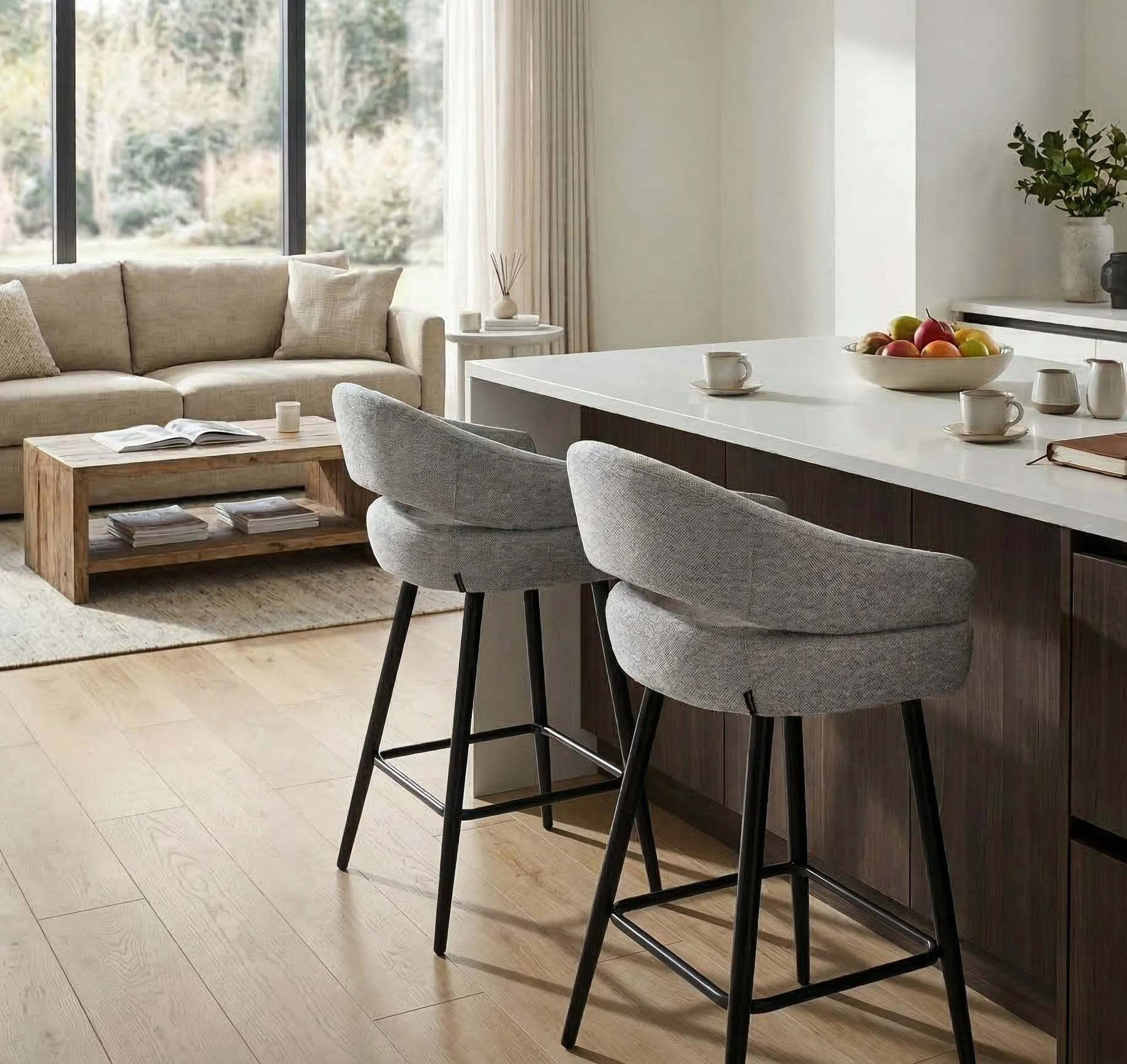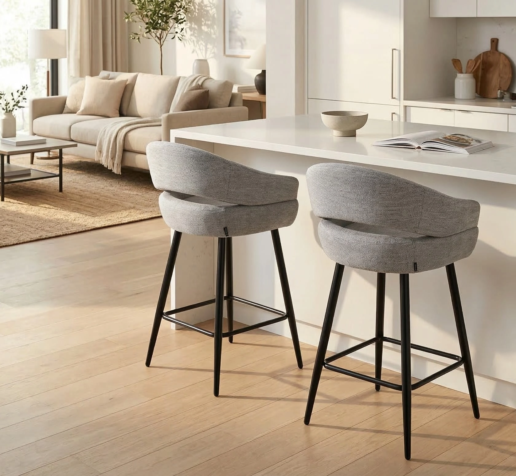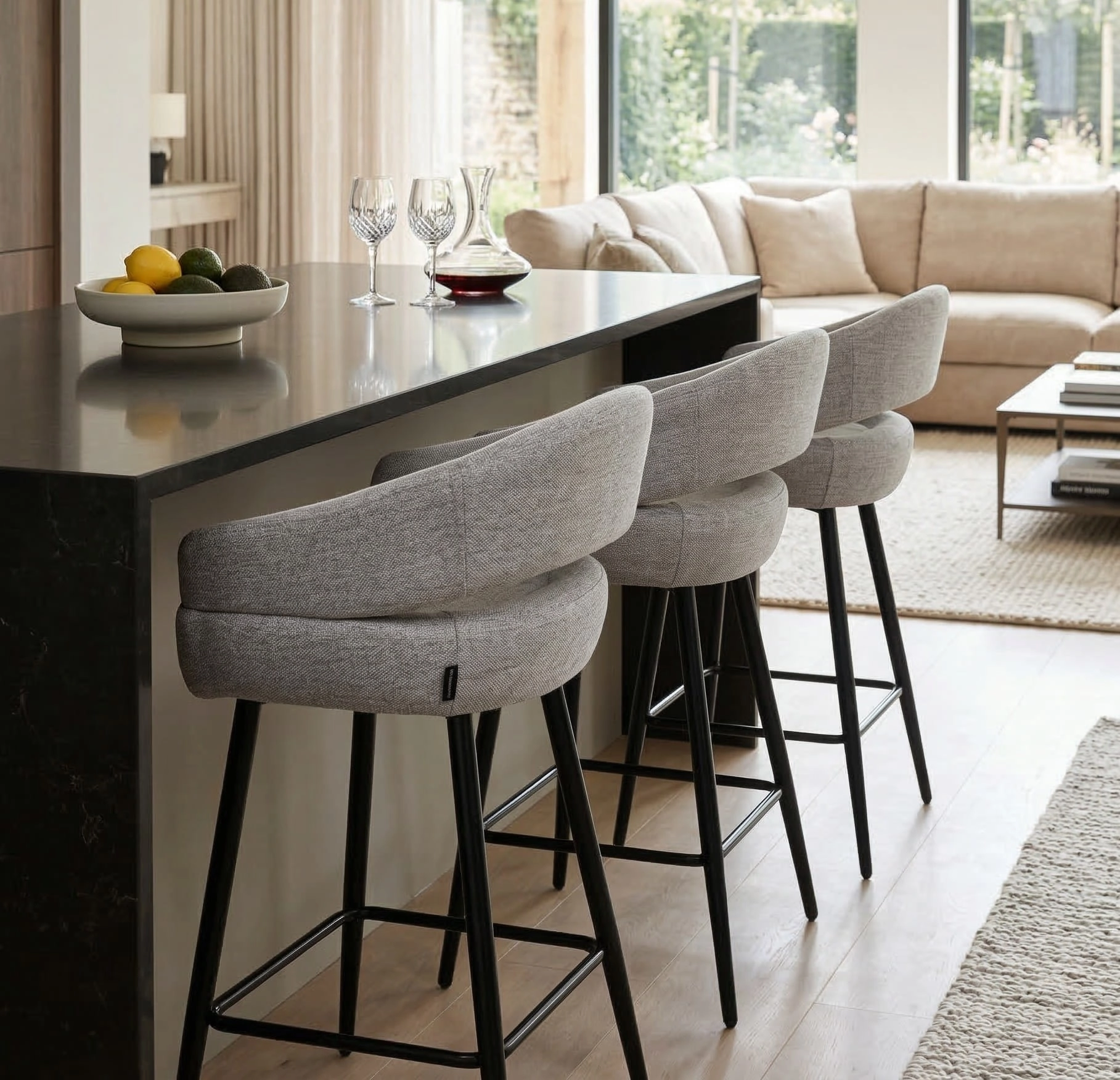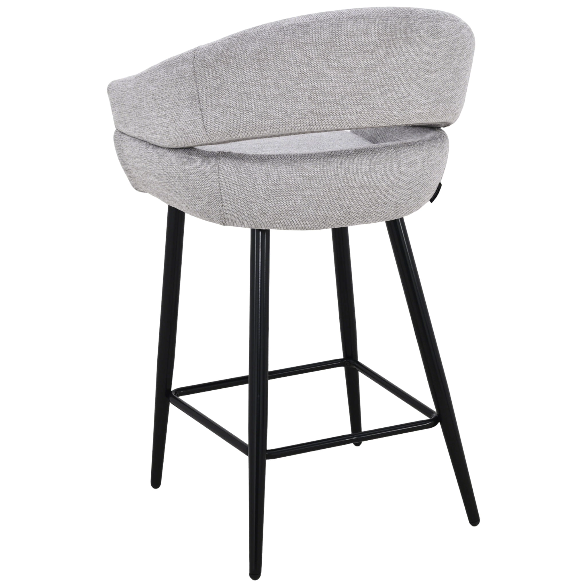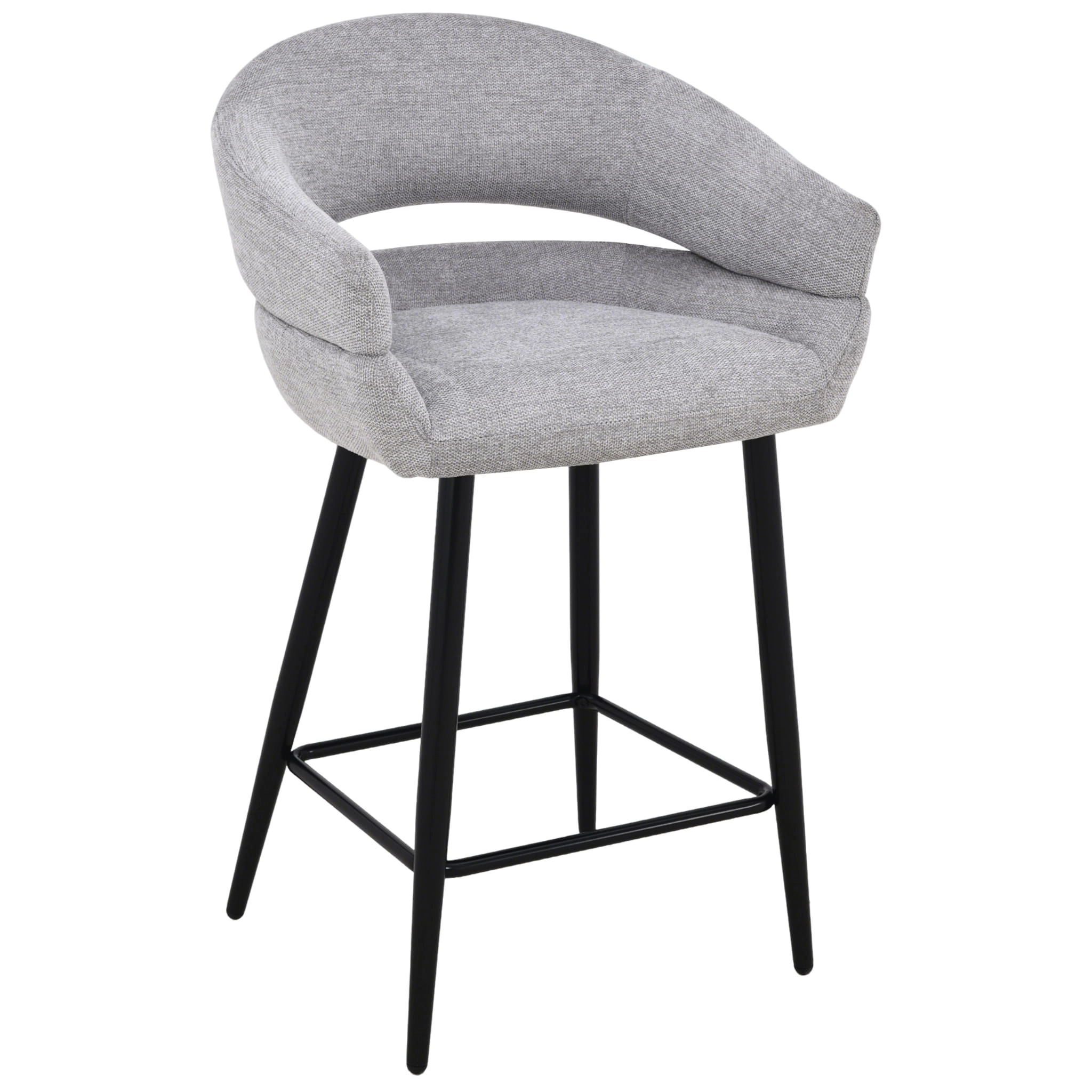 Szara tapicerka z subtelną strukturą tkaniny doskonale komponuje się z czarnymi, metalowymi nogami, tworząc uniwersalne połączenie do wnętrz w stylu nowoczesnym, skandynawskim, japandi czy loftowym. Stabilna konstrukcja i podnóżek zapewniają wygodę nawet podczas długich spotkań przy blacie kuchennym czy barze.