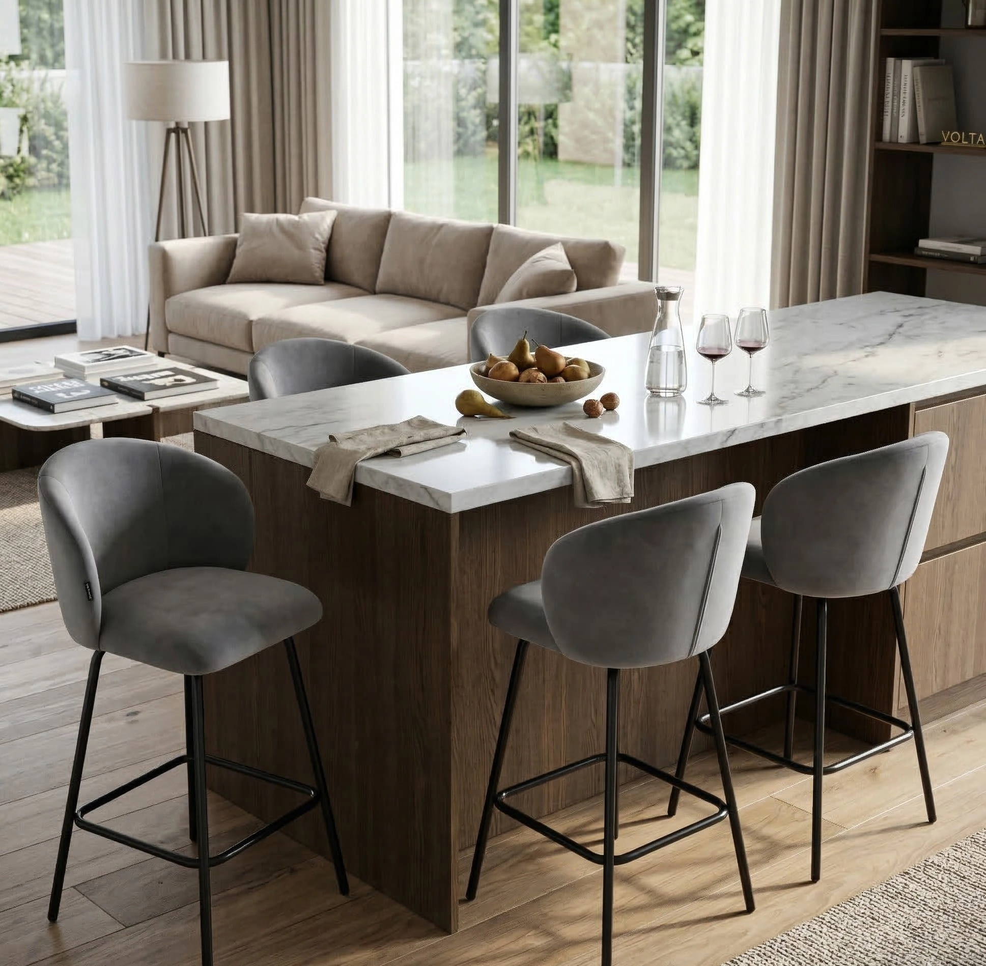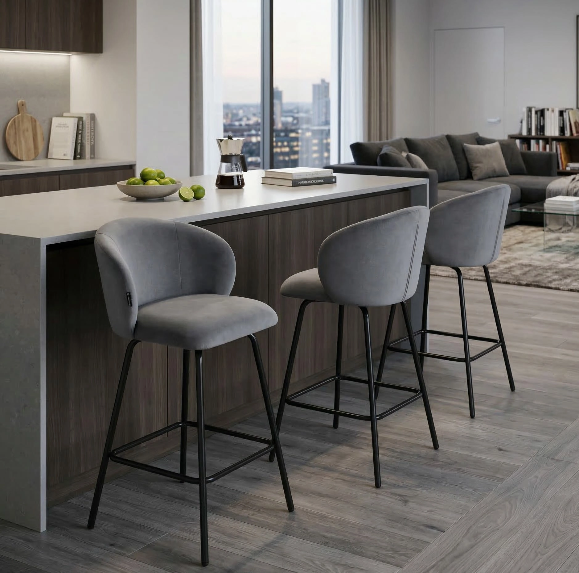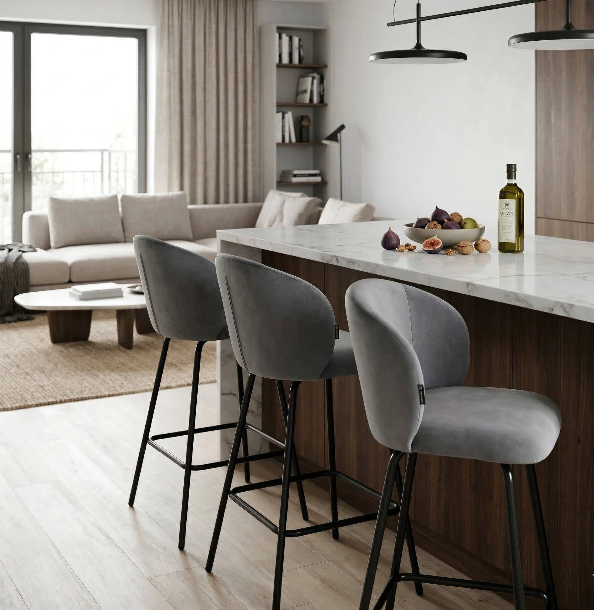Hoker kuchenny NEMI 65 cm to doskonały wybór dla osób ceniących komfort siedzenia, nowoczesną estetykę i funkcjonalność w codziennym użytkowaniu. Tapicerowany przyjemnym w dotyku welurem, w eleganckim szarym kolorze, doskonale wpisuje się w obecne trendy wnętrzarskie. Czarny metalowy stelaż podkreśla jego nowoczesny i minimalistyczny charakter, a wbudowany podnóżek zapewnia dodatkowy komfort podczas użytkowania.
