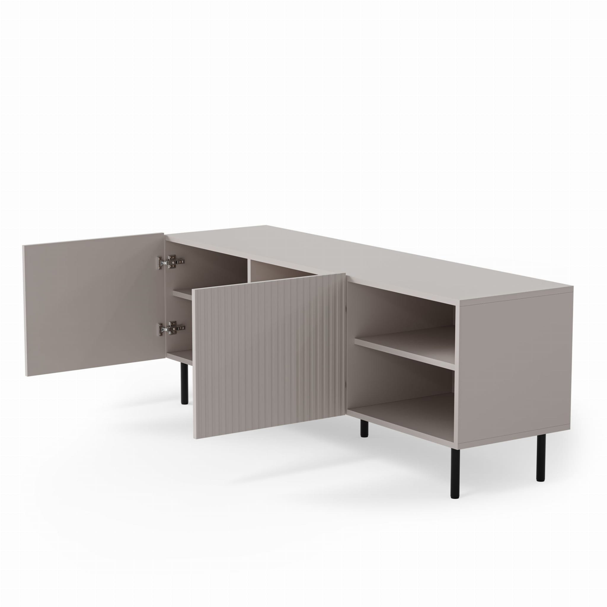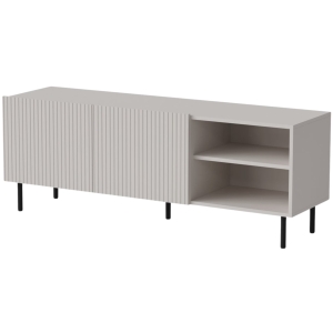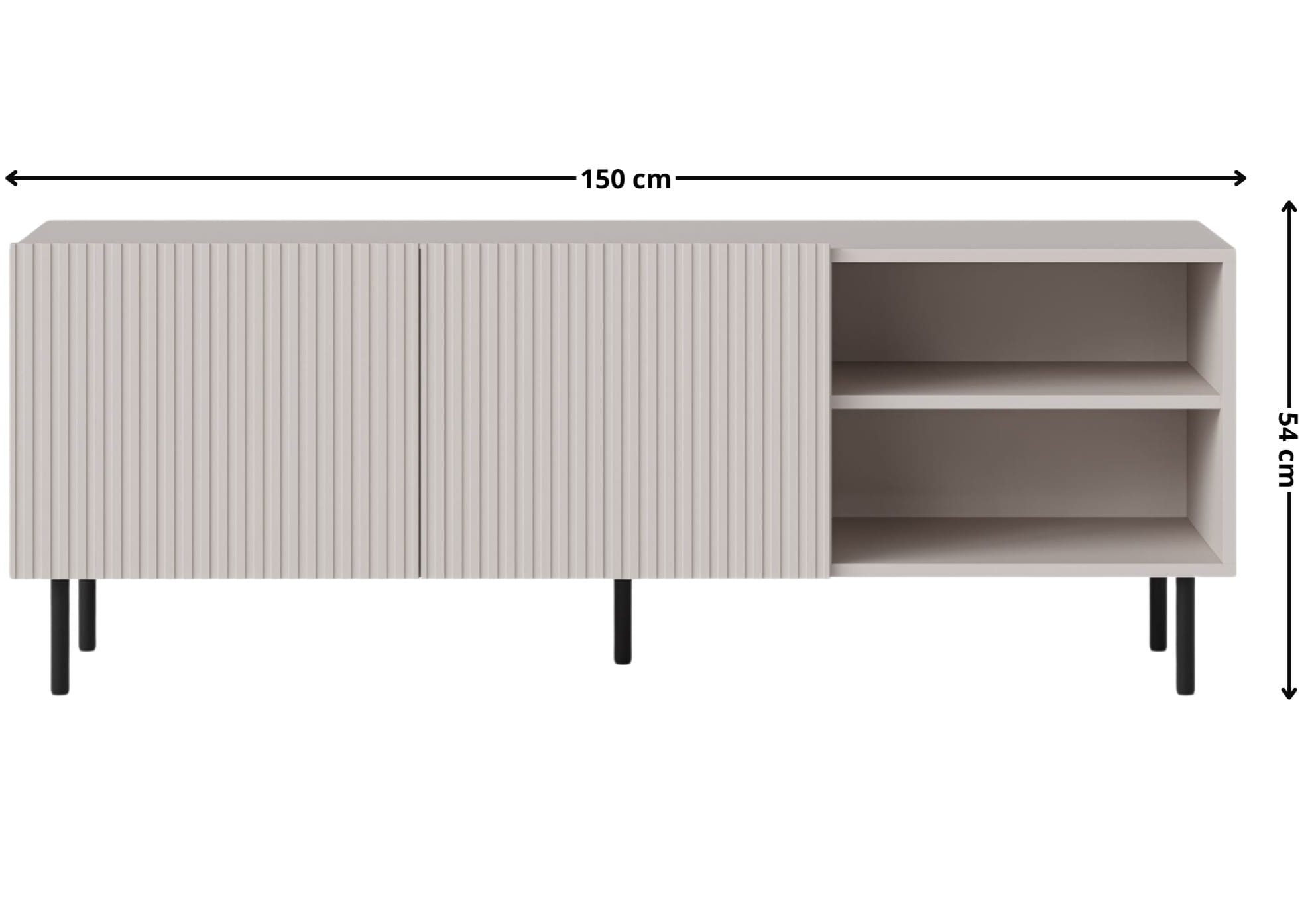 Dzięki długości 150 cm, szafka pomieści nie tylko telewizor, ale także dekodery, konsole czy kolekcję ulubionych filmów. Funkcjonalne wnętrze zawiera zarówno otwarte półki, jak i zamykane schowki, co pozwala zachować porządek w przestrzeni medialnej. Stabilna konstrukcja z metalu i MDF-u gwarantuje długowieczność i odporność na codzienne użytkowanie.