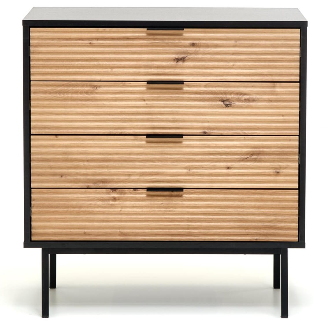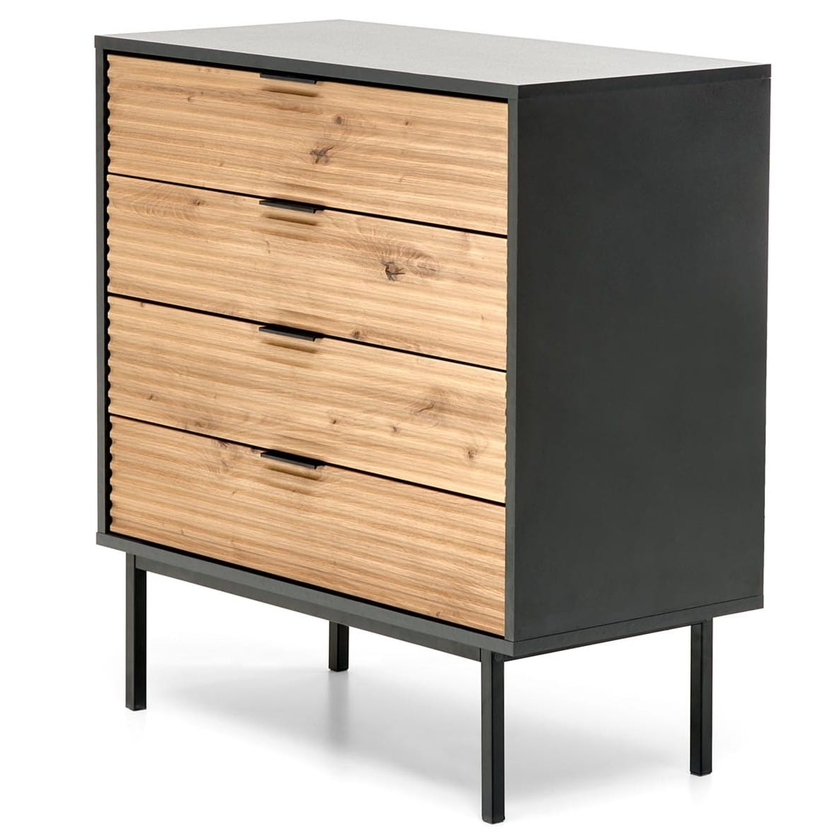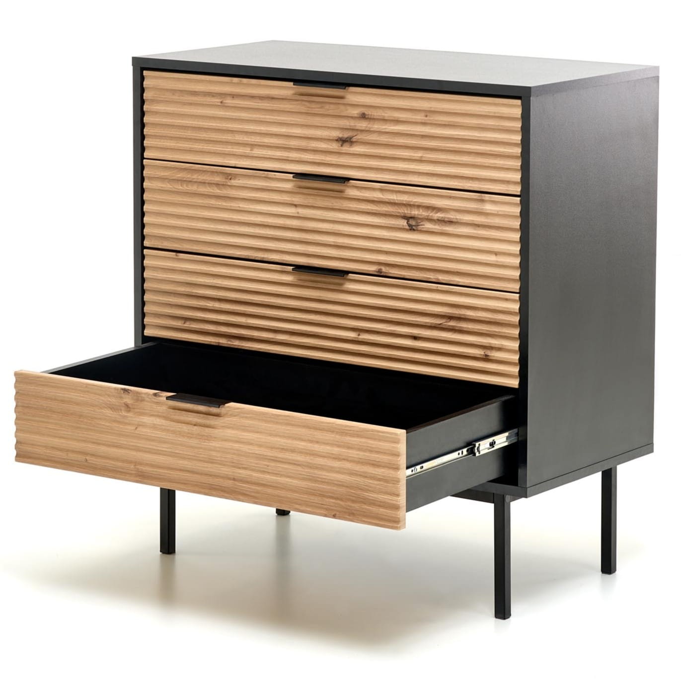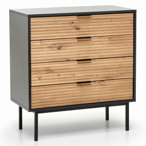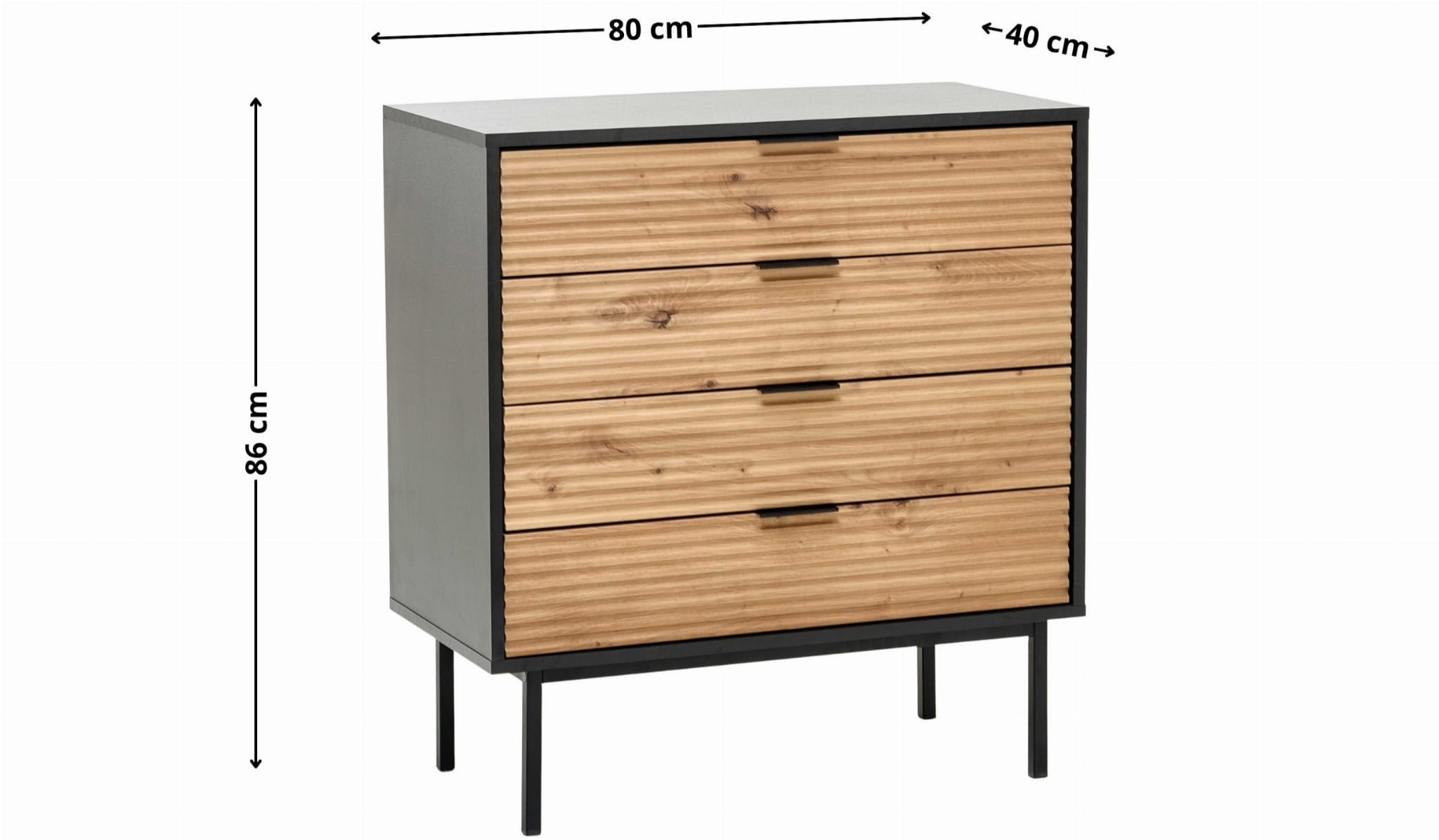 Cztery pojemne szuflady umożliwiają wygodne przechowywanie codziennych drobiazgów – od dokumentów i akcesoriów po tekstylia i dodatki dekoracyjne. Dzięki kompaktowej szerokości 80 cm komoda wpisze się zarówno w większe, jak i mniejsze wnętrza, tworząc praktyczną strefę przechowywania w salonie, sypialni, przedpokoju lub domowym biurze. To doskonała komoda do małego mieszkania, w której każdy centymetr jest dobrze wykorzystany.