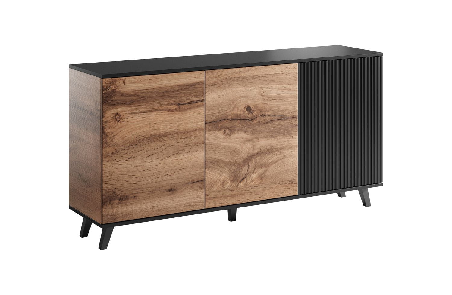 Komoda RANDOM KM-1 to połączenie nowoczesnego designu z funkcjonalnością, idealna do salonu, jadalni czy sypialni. Jej unikalna estetyka łączy naturalny wygląd drewna z eleganckim czarnym akcentem. Dzięki pionowym zdobieniom na froncie i subtelnym, matowym wykończeniu, komoda ta stanowi stylowy element wyposażenia, który podkreśli charakter wnętrza.