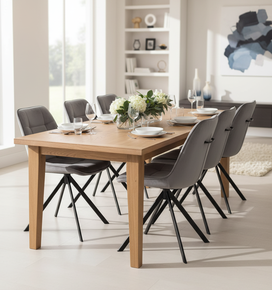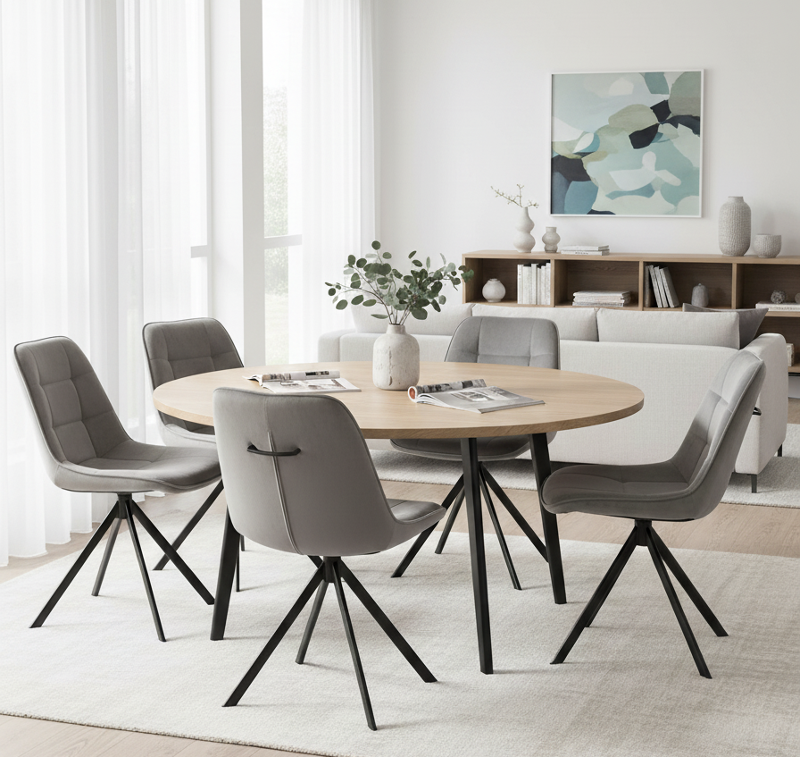 Krzesło tapicerowane BATI to połączenie wyjątkowego komfortu, funkcjonalności i modnego wyglądu. Nowoczesna forma, elegancki szary welur oraz metalowy stelaż sprawiają, że to krzesło doskonale odnajdzie się w stylowych wnętrzach. Mechanizm obrotowy 360° zapewnia wygodę użytkowania bez konieczności przesuwania siedziska, co czyni je idealnym wyborem zarówno do przestrzeni prywatnych, jak i profesjonalnych.