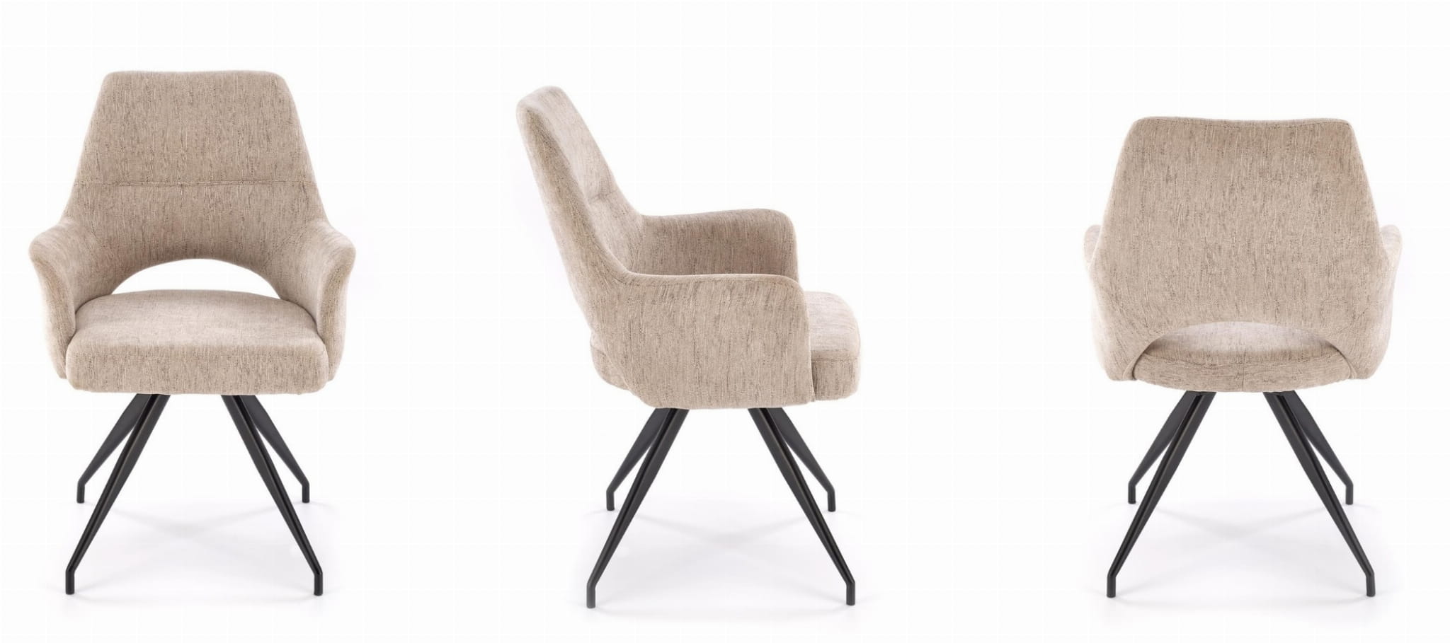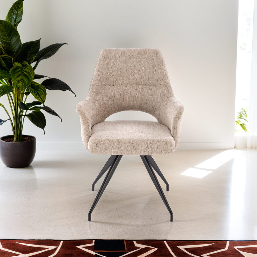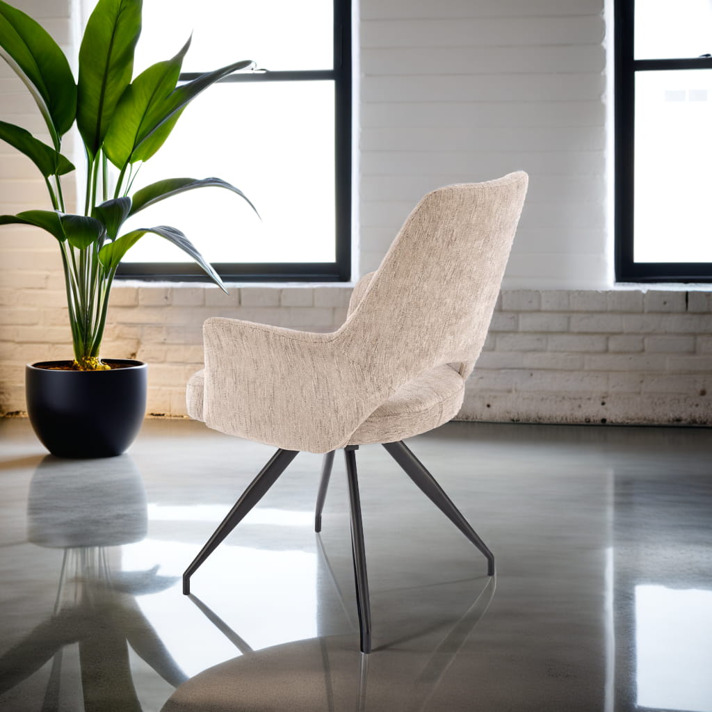 Krzesło zostało wyposażone w mechanizm obrotowy 180°, co sprawia, że sprawdzi się zarówno przy stole w jadalni, jak i przy biurku w gabinecie. Solidny metalowy stelaż w kolorze czarnym gwarantuje stabilność, a jego minimalistyczna forma doskonale wpisuje się w aktualne trendy wnętrzarskie.