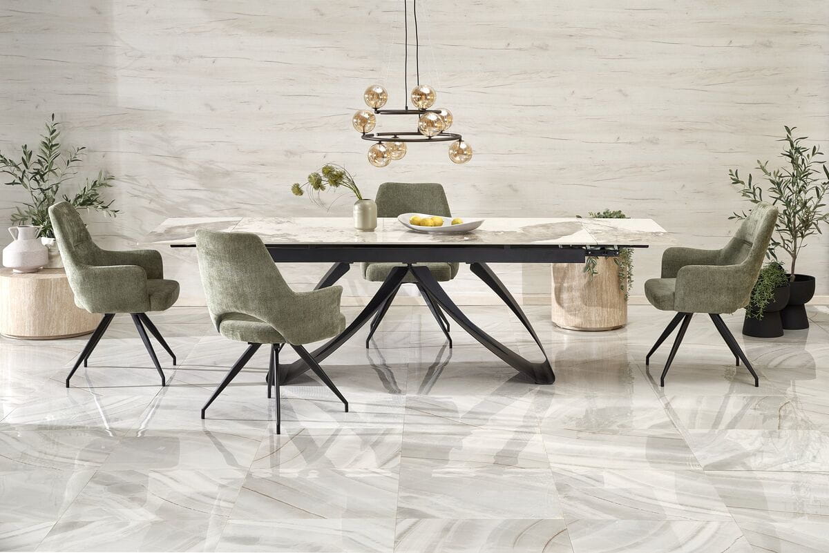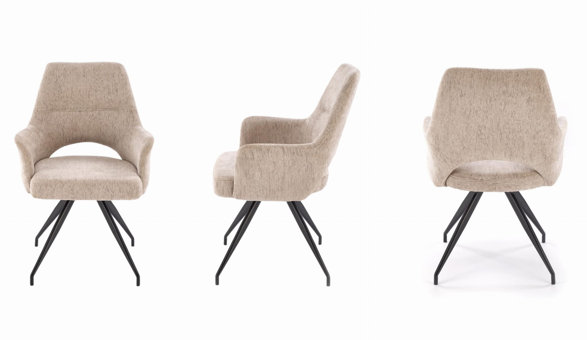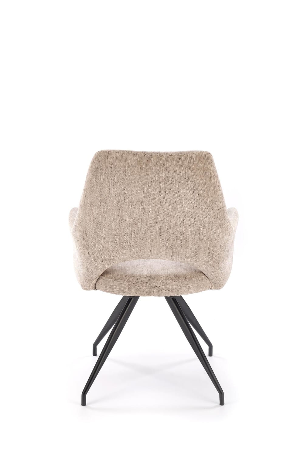 Krzesło zostało wyposażone w mechanizm obrotowy 180°, co sprawia, że sprawdzi się zarówno przy stole w jadalni, jak i przy biurku w gabinecie. Solidny metalowy stelaż w kolorze czarnym gwarantuje stabilność, a jego minimalistyczna forma doskonale wpisuje się w aktualne trendy wnętrzarskie.