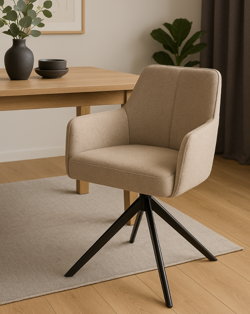 Krzesło tapicerowane tkaniną Brego w kolorze jasnego beżu prezentuje się niezwykle elegancko, a jego pikowane oparcie dodaje wnętrzu przytulności i stylu. Dzięki mechanizmowi obrotowemu 180° z funkcją powrotu, NOTTI doskonale sprawdzi się w dynamicznych przestrzeniach – w kuchni, przy stole, biurku czy toaletce.
