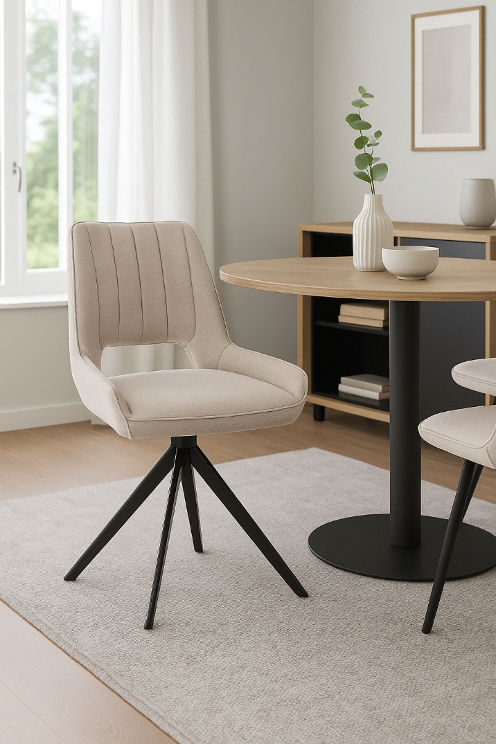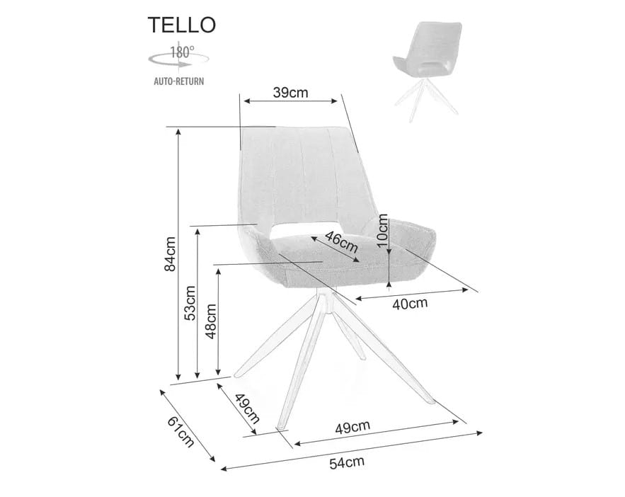 Krzesło TELLO to elegancki i nowoczesny mebel, który sprawdzi się w każdej przestrzeni – od jadalni, przez gabinet, aż po salon. Jego największym atutem jest mechanizm obrotowy z funkcją auto-return, który samodzielnie przywraca siedzisko do pozycji wyjściowej – to praktyczne i estetyczne rozwiązanie, które pozwala zachować porządek w pomieszczeniu.