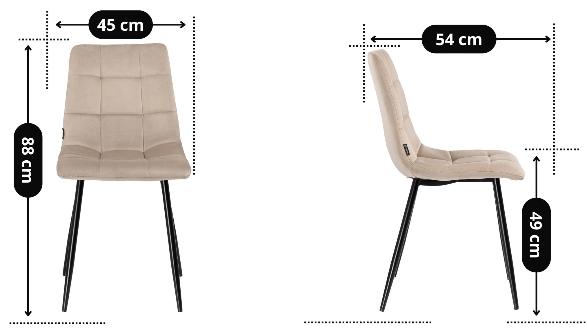 Krzesło tapicerowane BRUNO to połączenie elegancji i funkcjonalności. Wykonane z wysokiej jakości weluru w kolorze beżowym i osadzone na stabilnym, czarnym stelażu metalowym, świetnie sprawdzi się w codziennym użytkowaniu. Jego nowoczesny design doskonale komponuje się z różnymi aranżacjami wnętrz – od jadalni po domowe biuro.