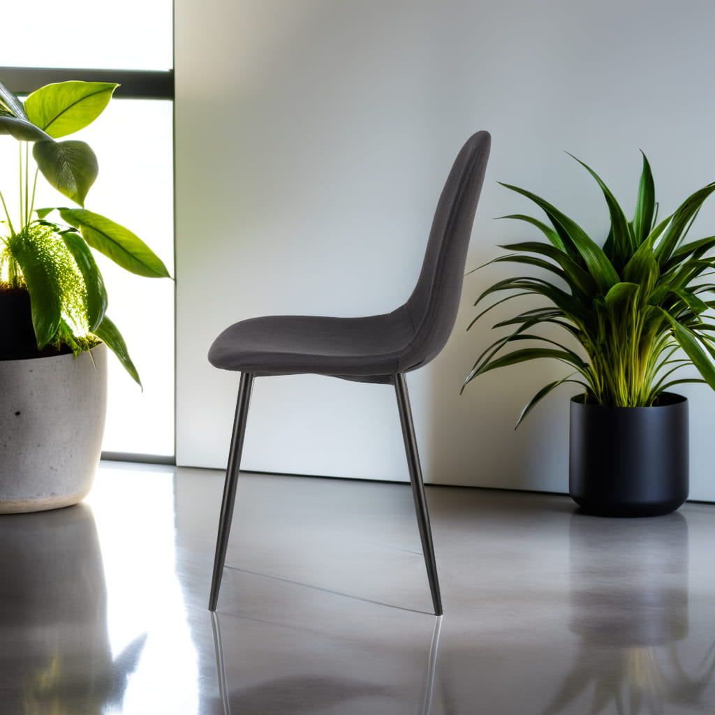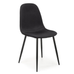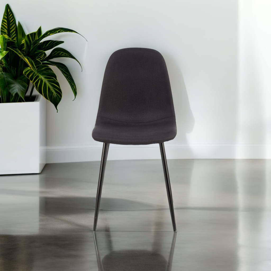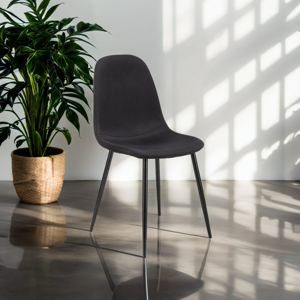 Czarna tapicerka z trwałej tkaniny oraz metalowe nogi w tym samym kolorze tworzą spójną, elegancką całość. Krzesło jest nie tylko stylowe, ale też niezwykle praktyczne – wygodne siedzisko i oparcie sprzyjają komfortowi podczas posiłków czy pracy przy stole.