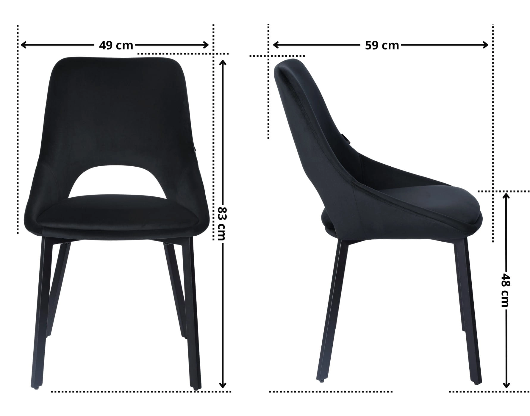 Krzesło tapicerowane LUMO w eleganckim czarnym kolorze to propozycja dla osób ceniących wyrazisty styl i ponadczasową estetykę. Czarna welurowa tapicerka, solidny metalowy stelaż oraz ergonomiczne wycięcie w oparciu sprawiają, że to krzesło do jadalni, salonu i kuchni doskonale łączy komfort z nowoczesnym designem. To idealny wybór do wnętrz, w których liczy się charakter i spójność aranżacji.