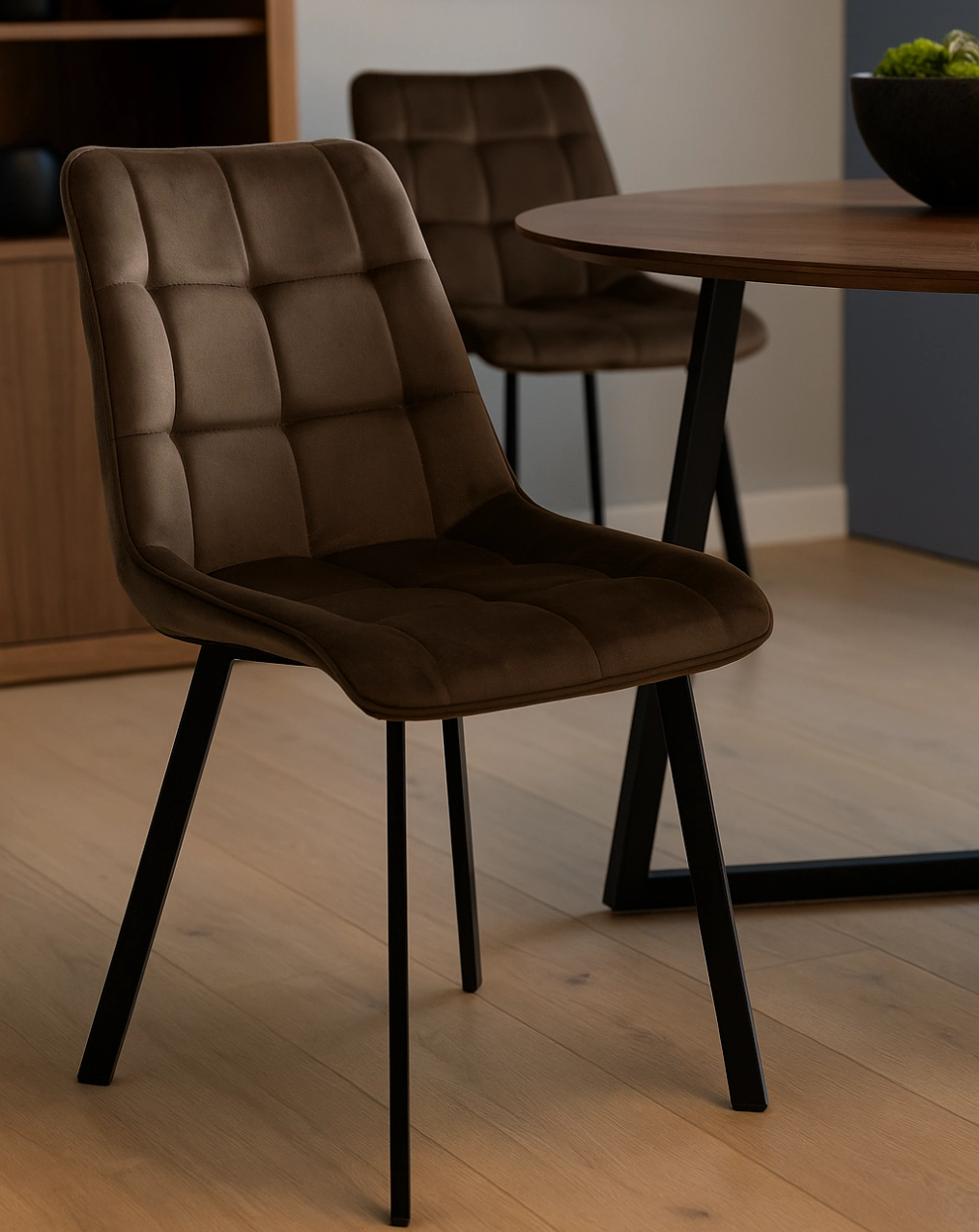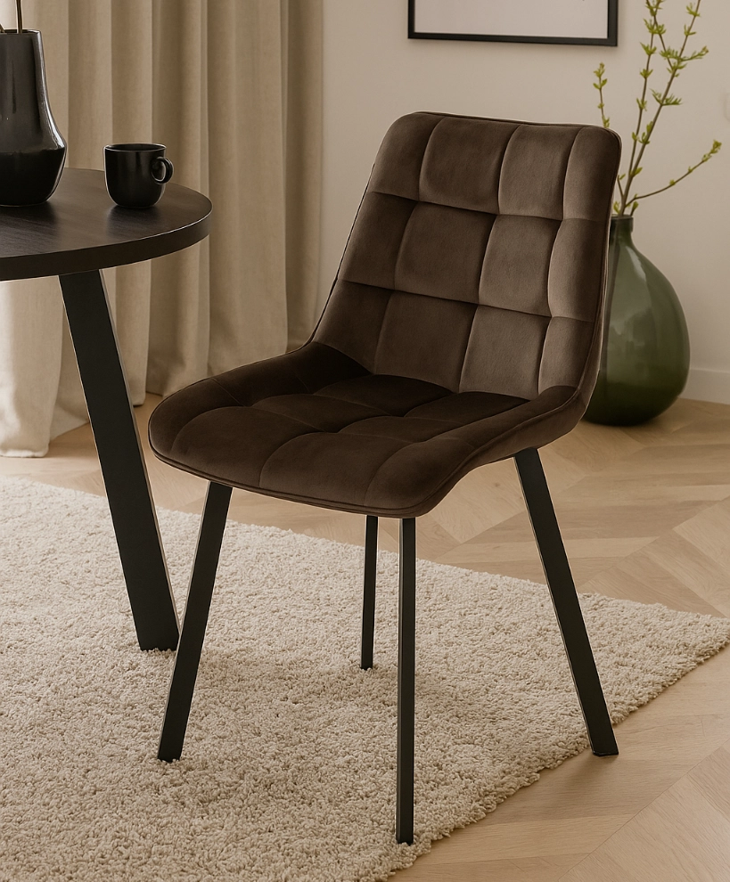 Krzesło tapicerowane TULUZA w kolorze brązowym to wyjątkowe połączenie klasycznej elegancji i nowoczesnego designu. Pikowane oparcie, miękka tapicerka z weluru i stabilne czarne metalowe nogi tworzą ponadczasowy mebel, który sprawdzi się w wielu wnętrzach. To doskonały wybór dla osób ceniących wygodę, styl i solidność wykonania.