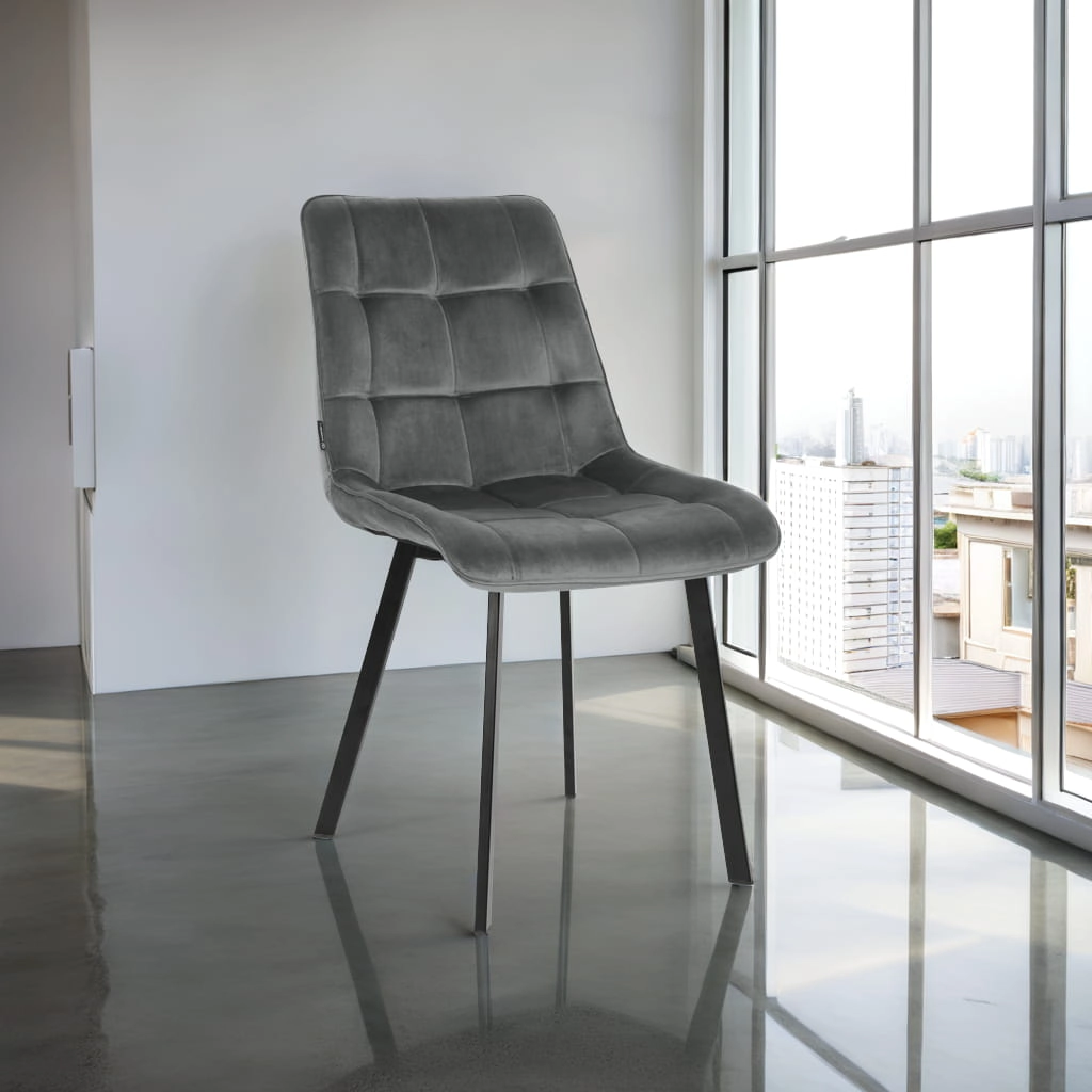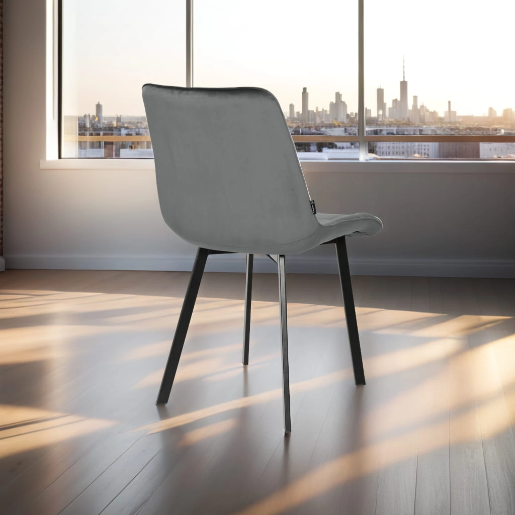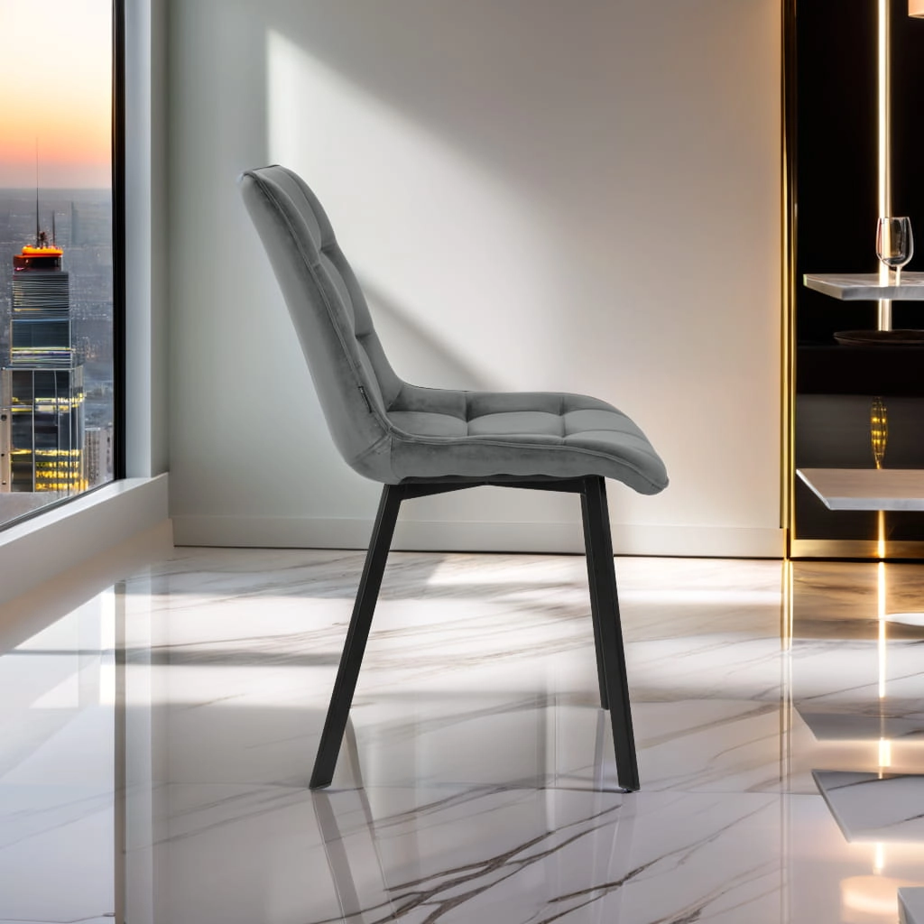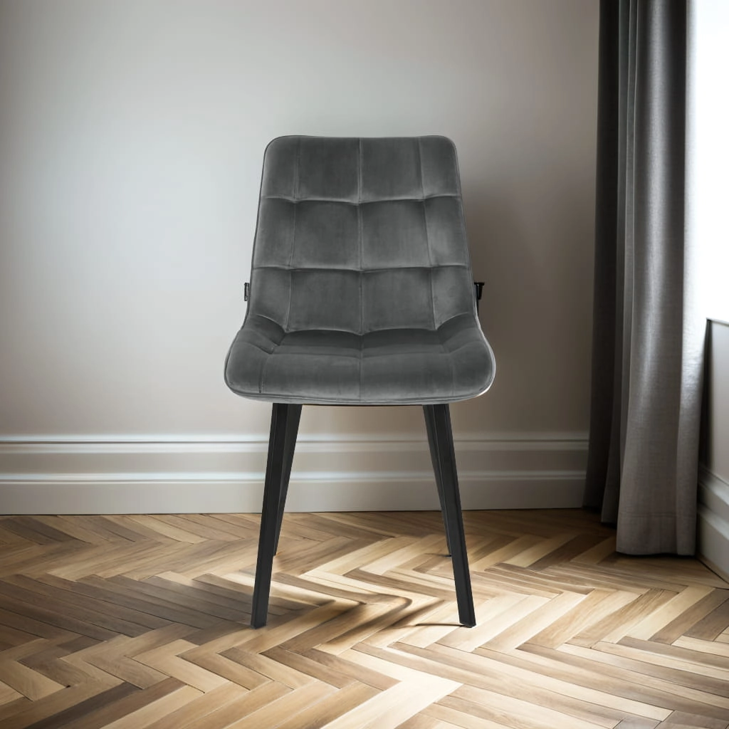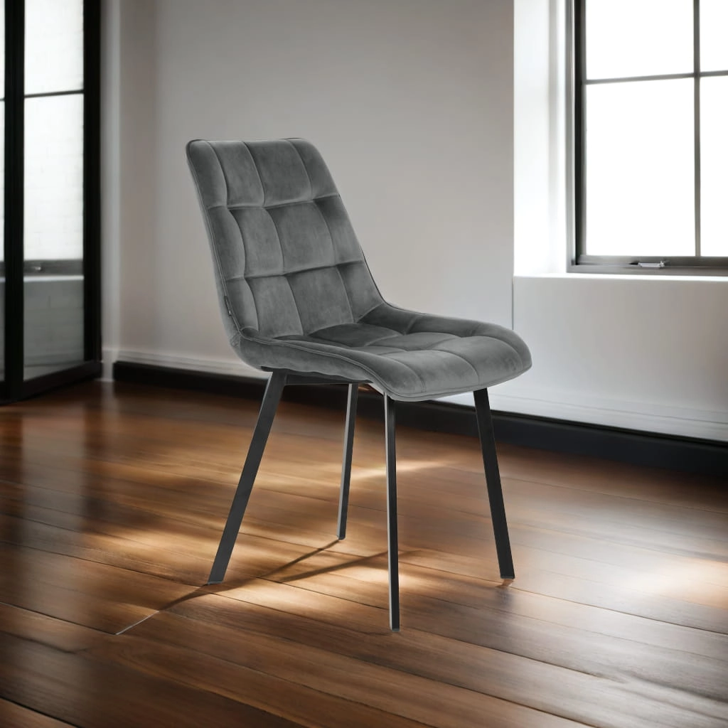 Krzesło tapicerowane TULUZA to doskonały wybór dla osób poszukujących harmonii między komfortem użytkowania a eleganckim designem. Welurowa tkanina w kolorze szarym, pikowane oparcie i metalowe nogi tworzą spójną, nowoczesną kompozycję, która zachwyci każdego miłośnika stylowych wnętrz. To krzesło, które dopełni Twoją jadalnię, salon, biuro lub przestrzeń przy toaletce, zapewniając wygodę na co dzień i elegancję na lata.