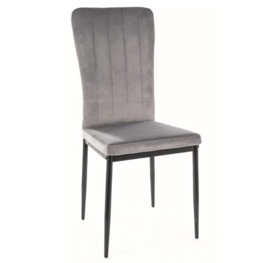 Krzesło tapicerowane VIGO velvet szare łączy smukłą sylwetkę i wysokie oparcie z miękką, elegancką tkaniną velvet Bluvel 14. Uniwersalna szarość pięknie współgra z czarnym metalowym stelażem, a lekka forma nie przytłacza przestrzeni. To nowoczesne krzesło do jadalni i salonu, które podnosi komfort i estetykę codziennych posiłków.