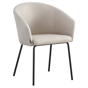 Krzesło NUVIO to kwintesencja nowoczesnej elegancji. Jego kubełkowe oparcie i zintegrowane podłokietniki sprawiają, że każda chwila spędzona przy stole staje się przyjemnością. Dzięki tapicerce z miękkiej tkaniny w ciepłym, beżowym odcieniu oraz metalowym czarnym nogom, krzesło łączy w sobie ponadczasową estetykę z codzienną wygodą.