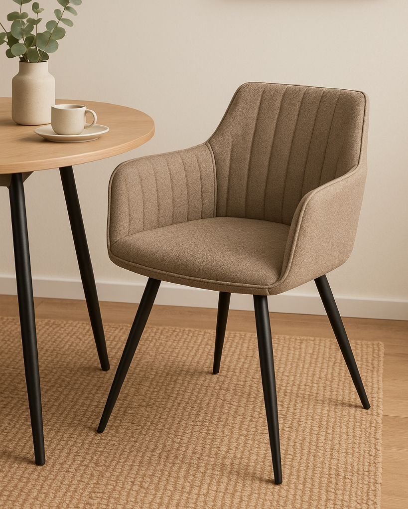 Beżowa tapicerka w odcieniu 34 Brego dodaje wnętrzom przytulności i klasy. Krzesło świetnie komponuje się z wystrojem w stylu skandynawskim, nowoczesnym lub minimalistycznym, a jego smukłe metalowe nogi w czarnym macie zapewniają stabilność i wytrzymałość.