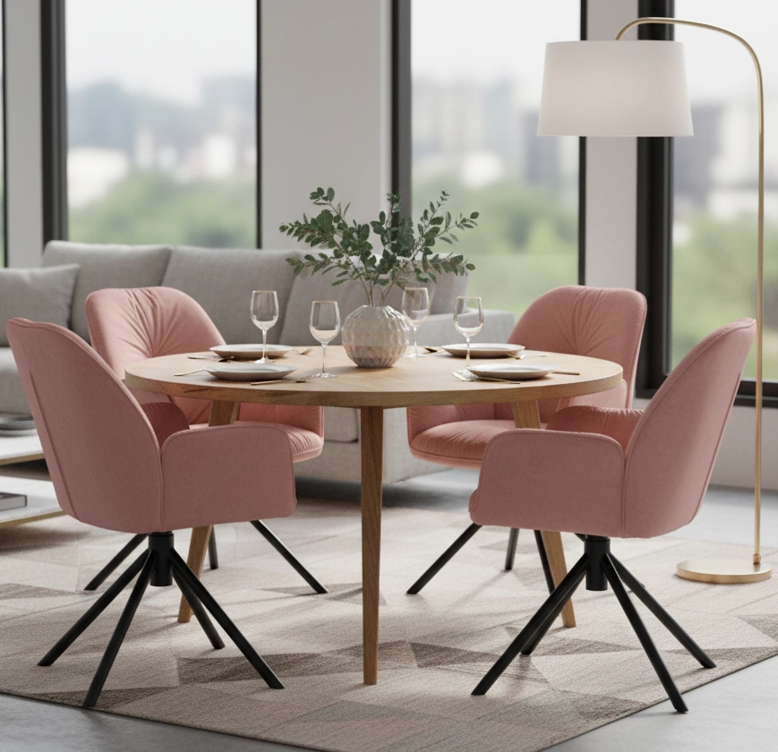 Różowe krzesło tapicerowane KOEN to połączenie nowoczesnej elegancji i maksymalnej funkcjonalności. Dzięki miękkiemu welurowemu siedzisku oraz wygodnym podłokietnikom zapewnia komfort użytkowania na co dzień – zarówno przy stole w jadalni, jak i podczas pracy przy biurku. Wyposażone w mechanizm obrotowy 360°, to idealny wybór dla osób ceniących mobilność, styl i wygodę.
