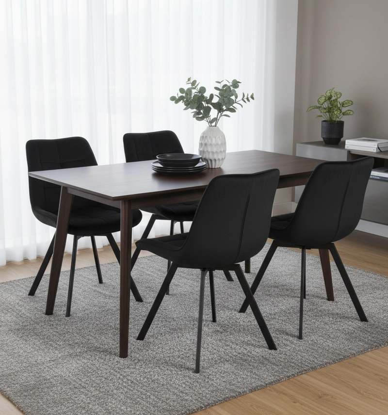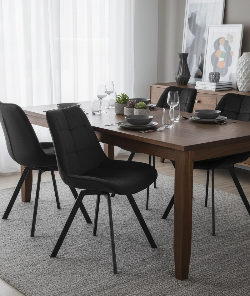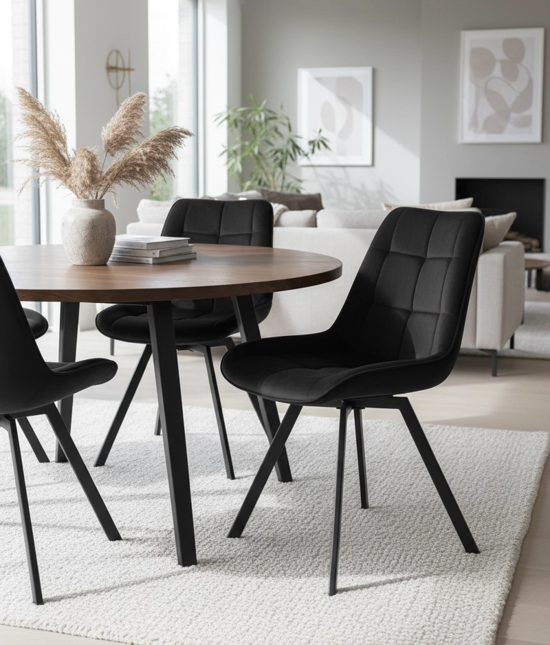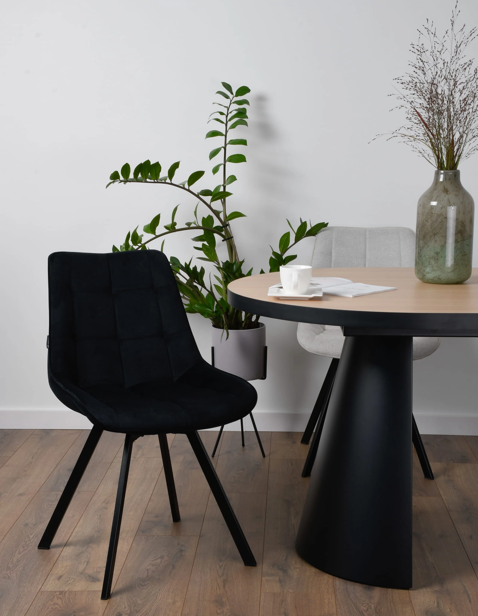 To nowoczesne krzesło tapicerowane zostało zaprojektowane z myślą o wygodzie – ergonomiczne oparcie i odpowiednio wyprofilowane siedzisko gwarantują komfort nawet przy długotrwałym użytkowaniu. Jego uniwersalna, czarna kolorystyka sprawia, że pasuje do wielu trendów wnętrzarskich – od minimalistycznych, przez industrialne i loftowe, aż po glamour.
