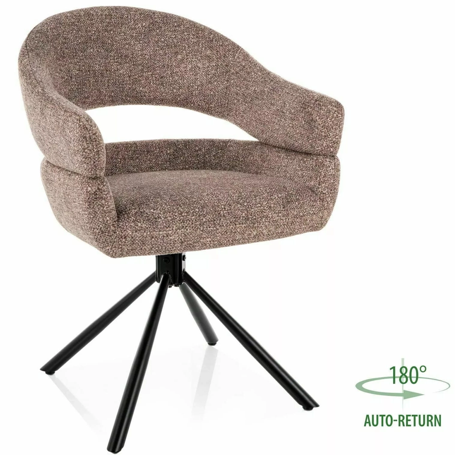 Krzesło tapicerowane obrotowe LEO to propozycja dla osób, które chcą połączyć wygodę codziennego siedzenia z uporządkowanym wyglądem wnętrza. Ciemnobeżowa tkanina Leo nadaje mu miękki, przytulny charakter, a czarny metalowy stelaż dodaje nowoczesnej lekkości. Dzięki funkcji auto-return 180° siedzisko obraca się podczas siadania i wstawania, a następnie wraca do pierwotnej pozycji, dlatego przestrzeń przy stole wygląda bardziej schludnie.