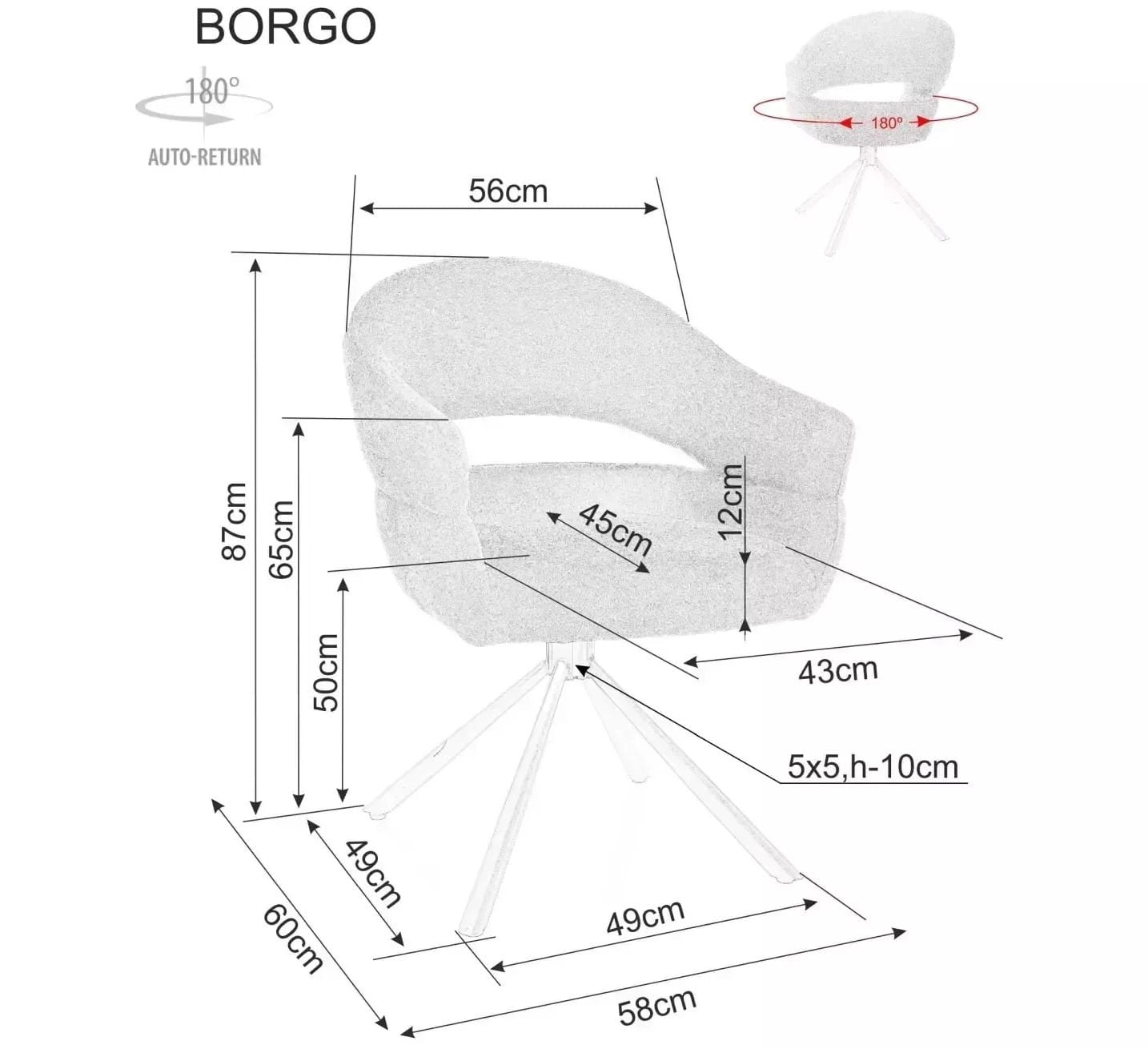 - Funkcja auto-return 180° – siedzisko obraca się w zakresie 180° i wraca do pozycji wyjściowej, dzięki czemu łatwiej usiąść i wstać od stołu.