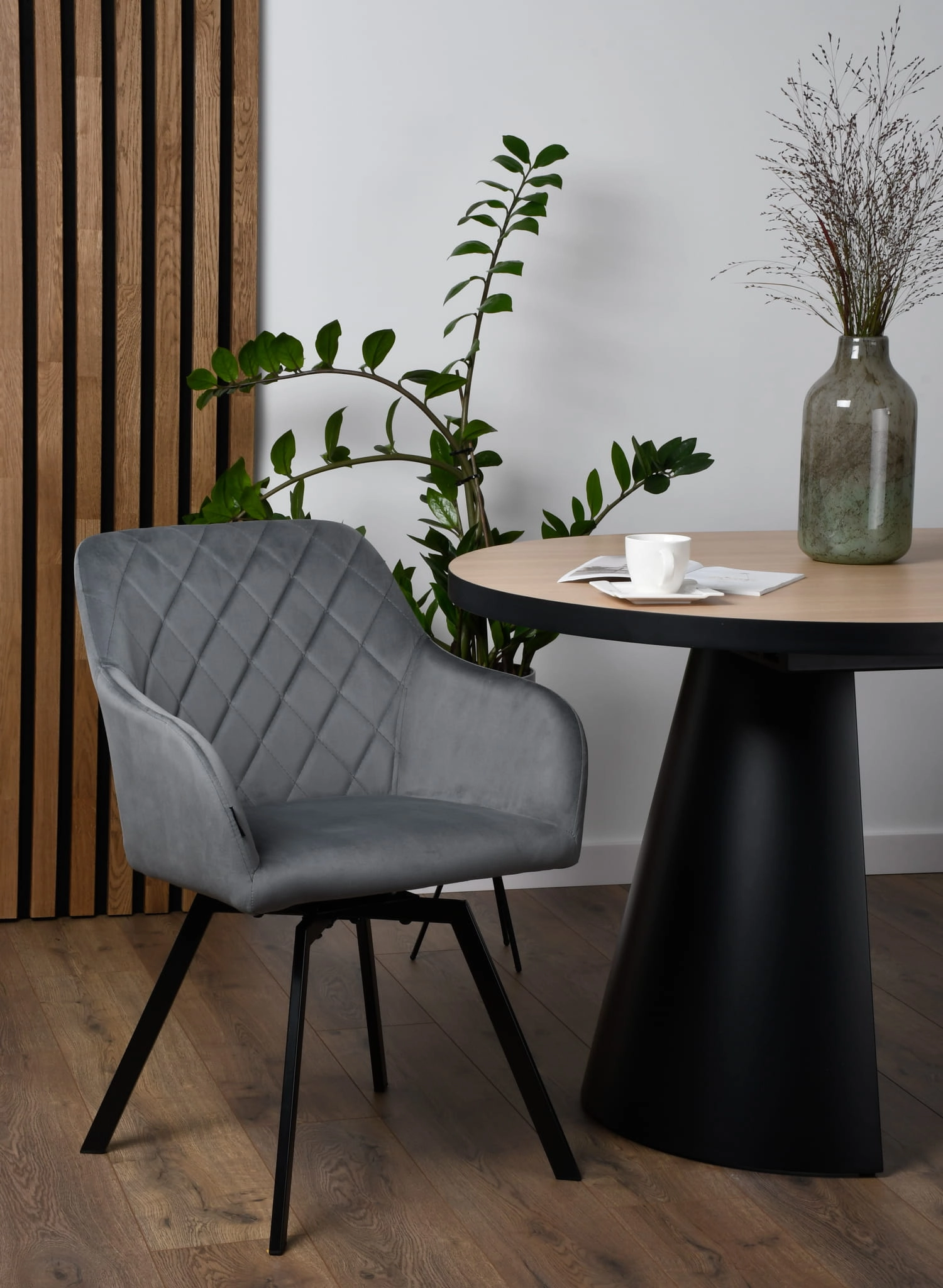 Krzesło PANKO to nowoczesna propozycja dla osób, które pragną połączyć estetykę z praktycznym użytkowaniem. Pokryte miękką, elegancką tkaniną welurową siedzisko w kolorze szarym zachwyca subtelnym blaskiem, a pikowane oparcie dodaje charakteru całej konstrukcji. Szare metalowe nogi gwarantują stabilność i trwałość, a mechanizm obrotowy 360° zapewnia swobodę ruchów bez konieczności wstawania.