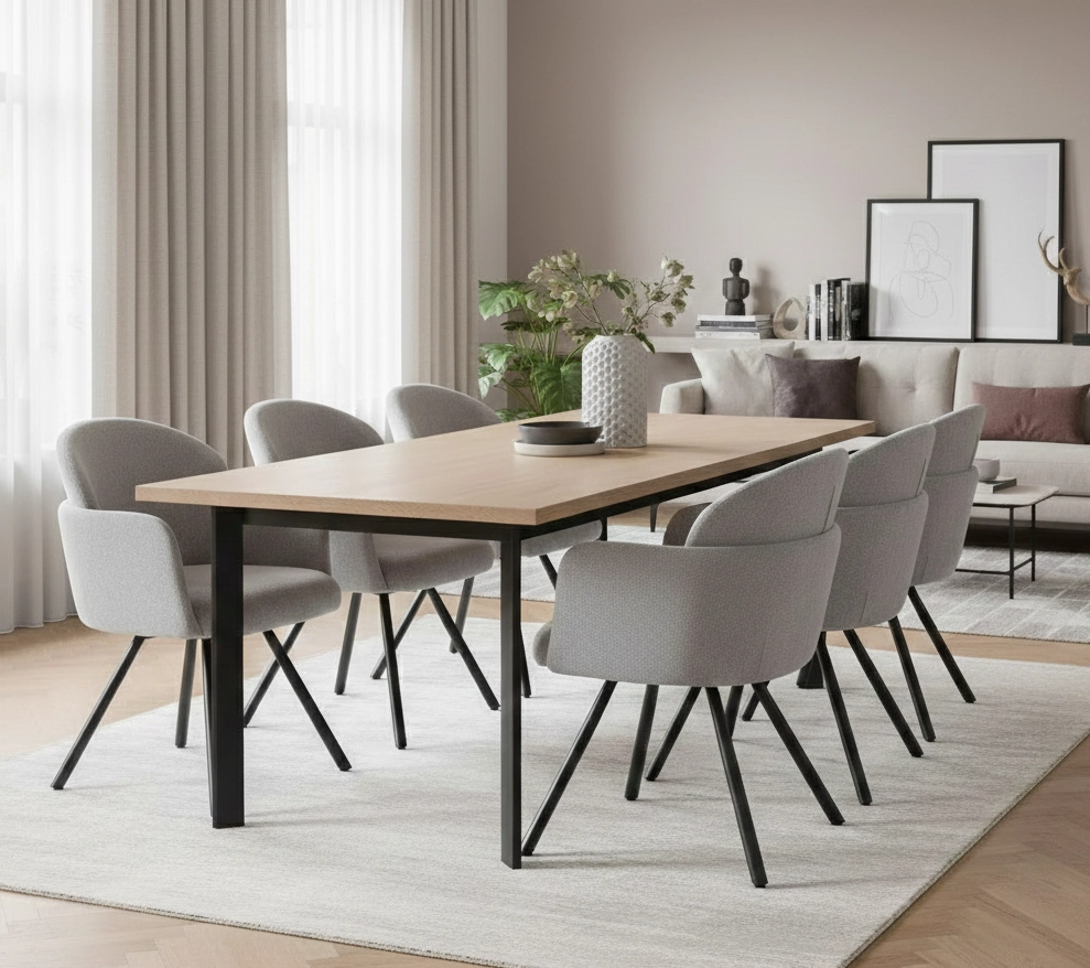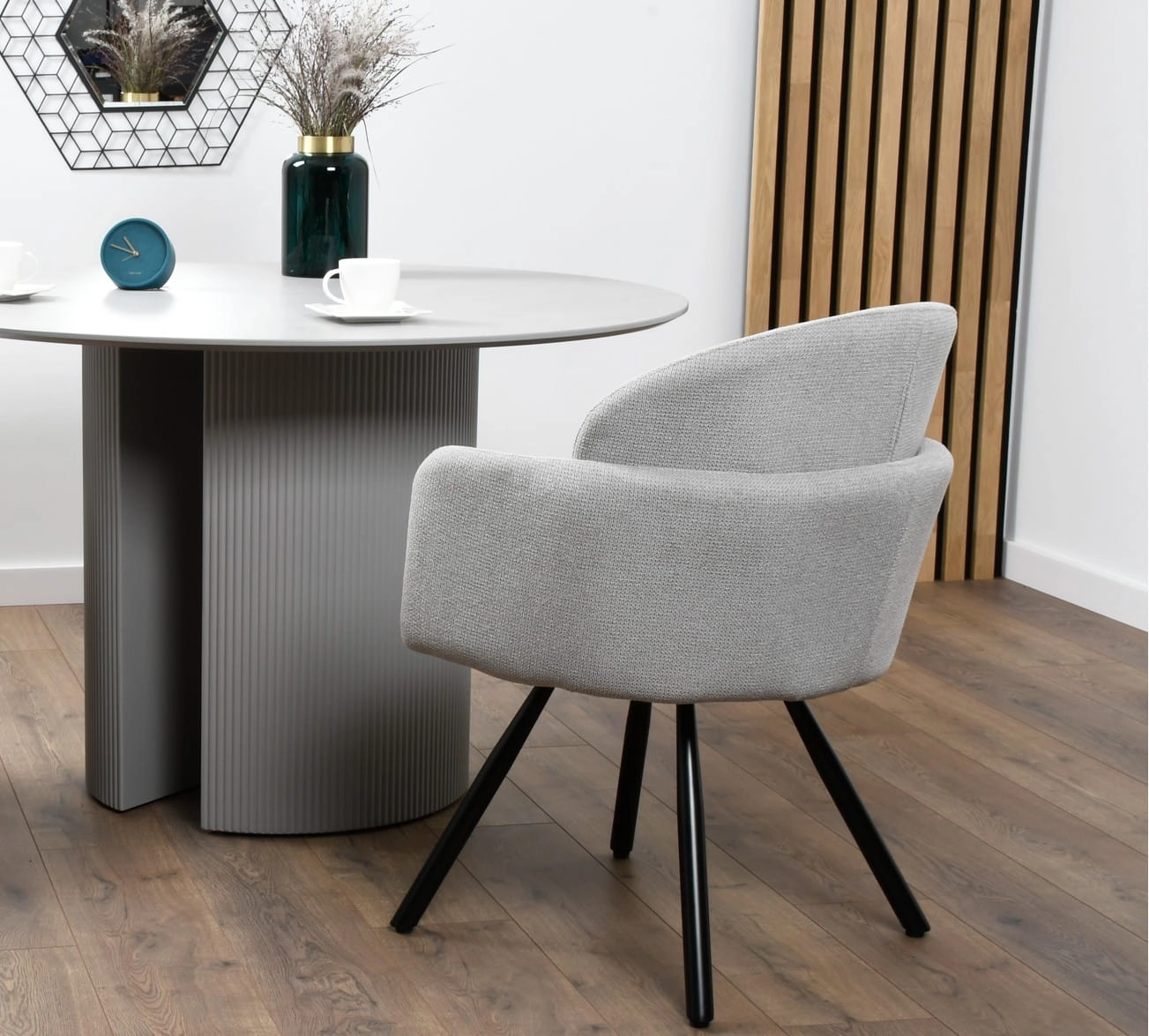 To doskonały wybór do nowoczesnych wnętrz – jako krzesło do jadalni loft, nowoczesne krzesło biurowe czy nawet krzesło do toaletki szare w wariancie kolorystycznym szarym. Czarne metalowe nogi kontrastują z jasną tapicerką, co dodaje meblowi wyjątkowego charakteru.