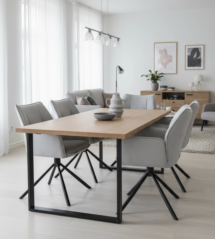 Jego ponadczasowa, szara tapicerka doskonale komponuje się z czarnym metalowym stelażem, tworząc elegancką całość. To rozwiązanie idealne dla wnętrz urządzonych w stylu skandynawskim, loftowym czy nowoczesnym. Funkcja auto-return to nie tylko wygoda, ale i oszczędność miejsca – siedzisko zawsze wraca na swoje miejsce po użyciu.