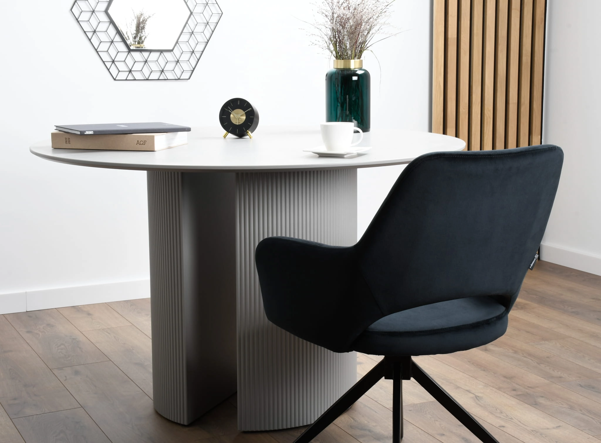 Obrotowe krzesło tapicerowane ERIM to połączenie wygody, stylu i nowoczesnych rozwiązań. Pokryte miękkim welurem, z obrotowym mechanizmem 360° i solidną, metalową podstawą w kolorze czarnym – to idealna propozycja dla osób ceniących design, komfort i funkcjonalność w codziennym użytkowaniu. Świetnie sprawdzi się zarówno w domowym biurze, jak i przy toaletce, biurku czy w jadalni.