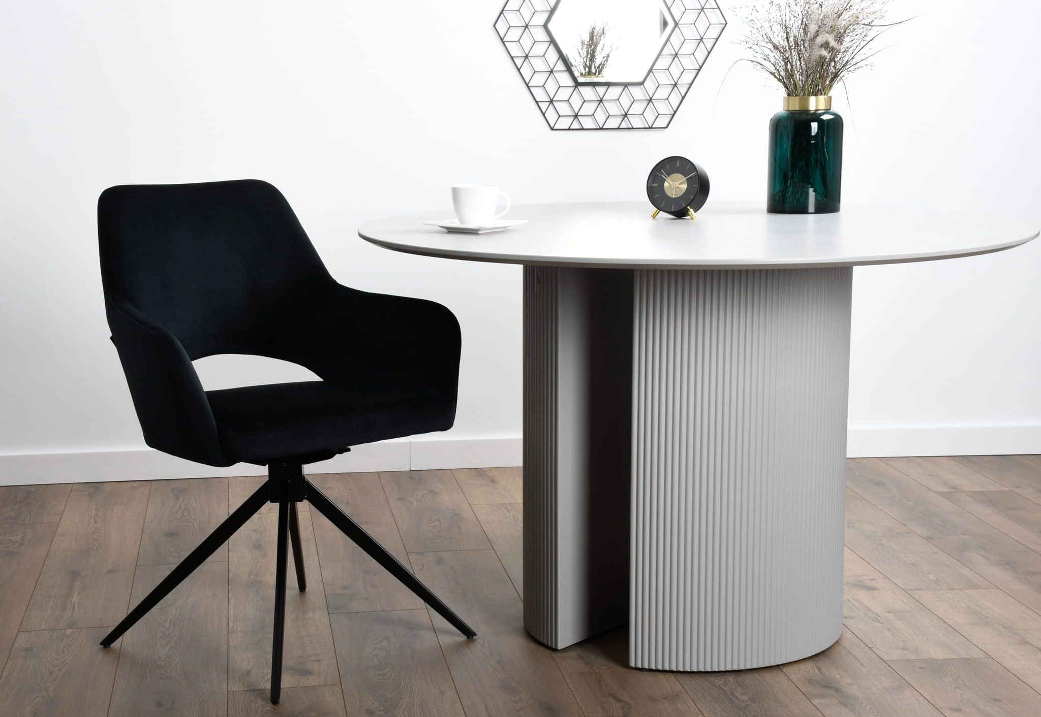 Jeśli szukasz eleganckiego krzesła tapicerowanego do biura, jadalni lub toaletki, model ERIM będzie strzałem w dziesiątkę. Jego uniwersalny design i funkcjonalność sprawiają, że doskonale wpisuje się zarówno w domowe, jak i komercyjne wnętrza. Wysokiej jakości welurowa tkanina w klasycznej czerni prezentuje się luksusowo i stylowo, a do tego jest przyjemna w dotyku i łatwa w czyszczeniu.